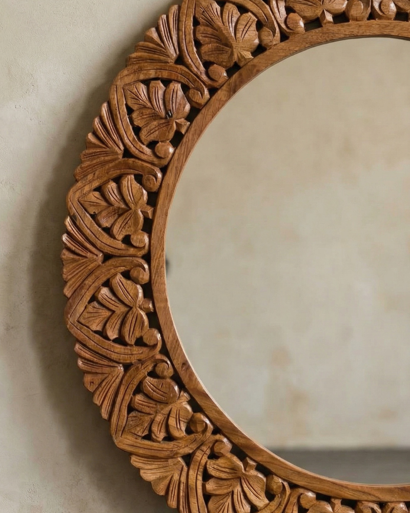 Hand-carved from solid mango wood, each piece showcases the natural grain and intricate detailing of traditional craftsmanship. Warm, textural, and timeless — designed to bring quiet character to any space.