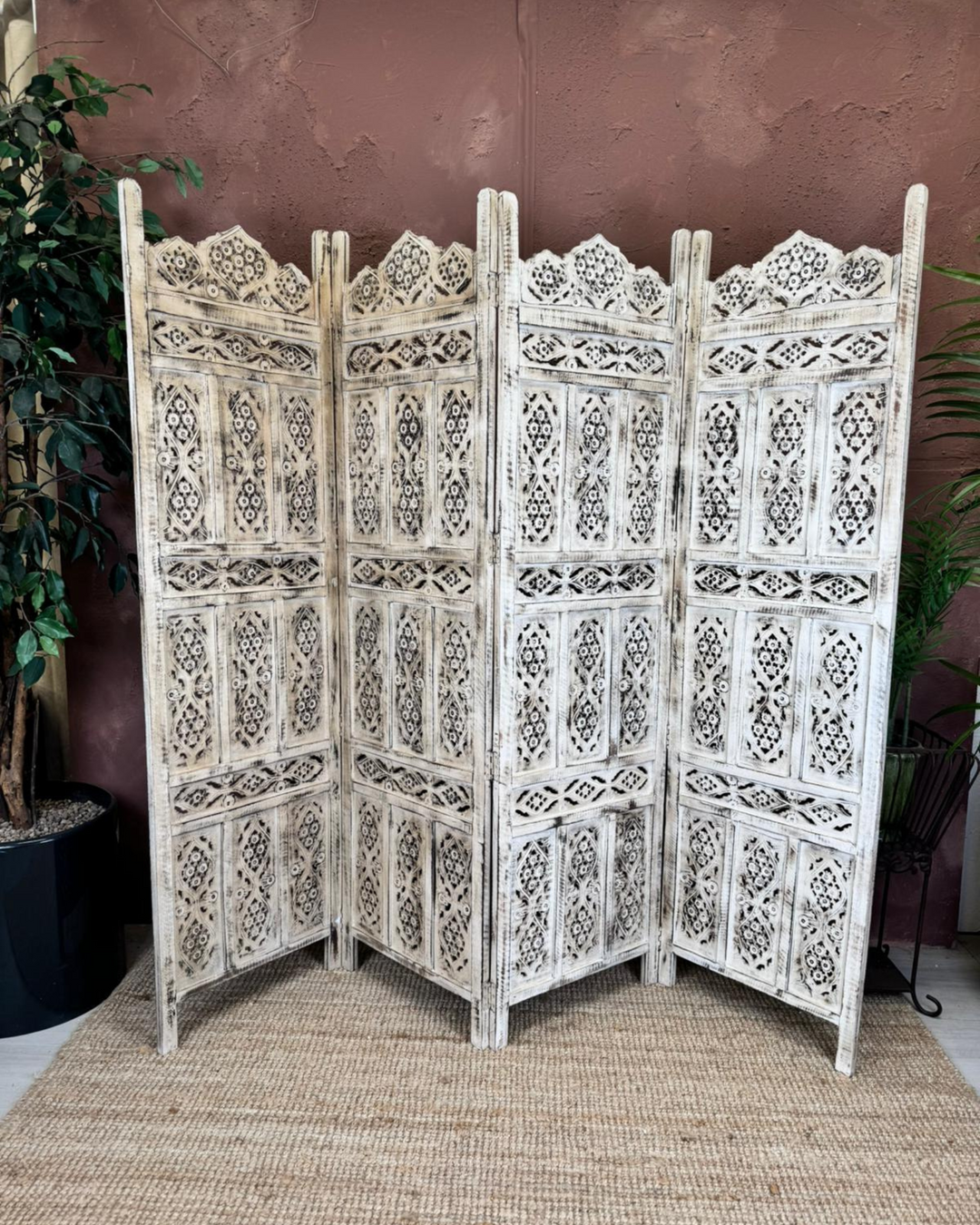 A stunning statement piece, this hand-carved wooden screen is both decorative and practical. Whether used as a room divider or a decorative backdrop, it brings an air of timeless craftsmanship into the home.