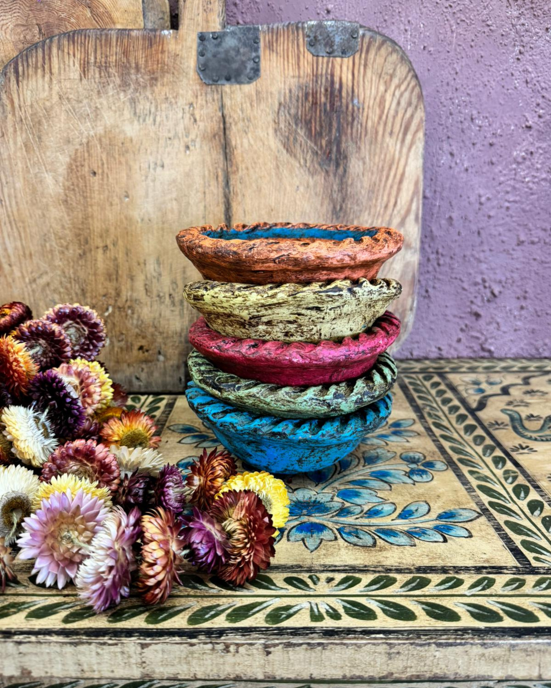 Delicately hand-painted by skilled artisans, these paper mâché bowls add an artistic flair to any space. Their unique crimped edges and vibrant patterns reflect the rich cultural heritage of Indian craftsmanship. Perfect as decorative accents or for holding treasured keepsakes.