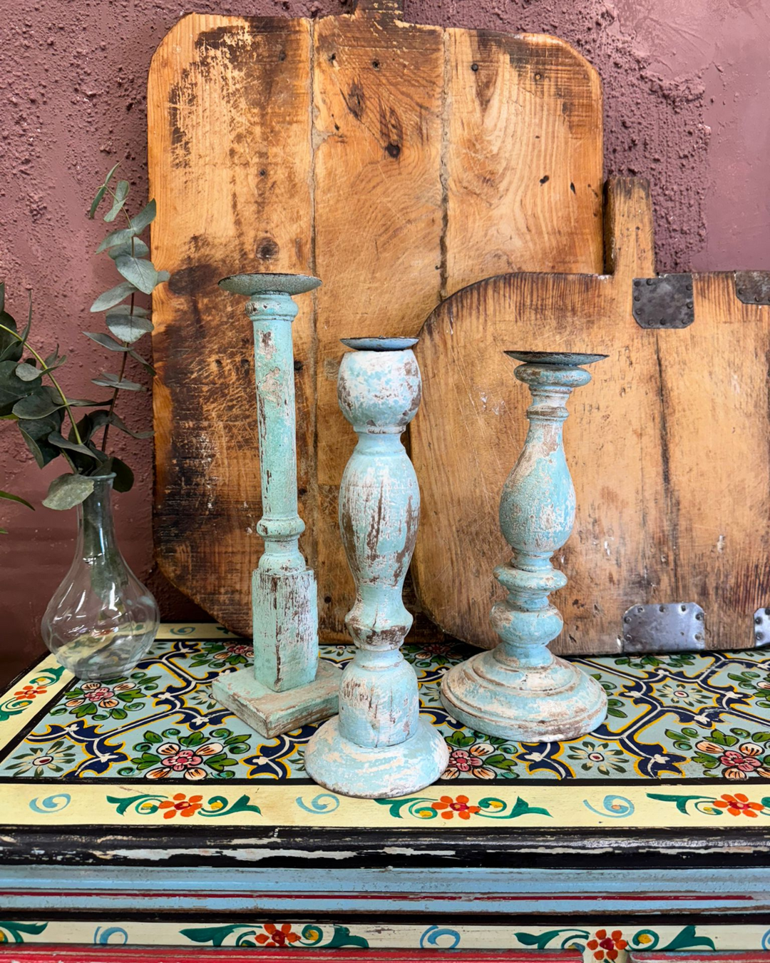 3. Set of 3 Vintage Mango Wood Candlestick Holders – Rustic Blue Finish