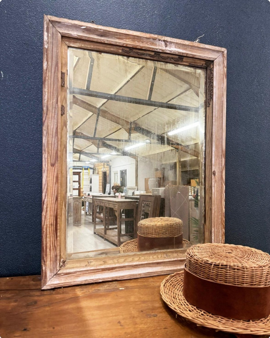 With its weathered wood frame and ornate detailing, this vintage-inspired mirror brings depth and character to any interior. A truly special piece for those who love rustic, well-travelled aesthetics.