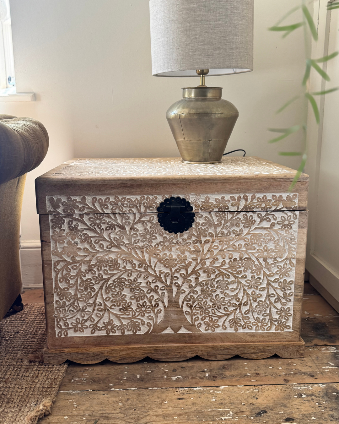 Infuse your home with understated elegance using this versatile trunk. Detailed with the Tree of Life motif in a soft whitewash, it’s perfect for storing blankets or acting as a stylish coffee table.