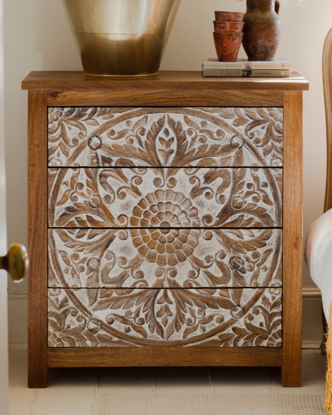Organise your space with elegance: four spacious drawers carved with layered petal motifs lend this chest both function and a graceful presence.