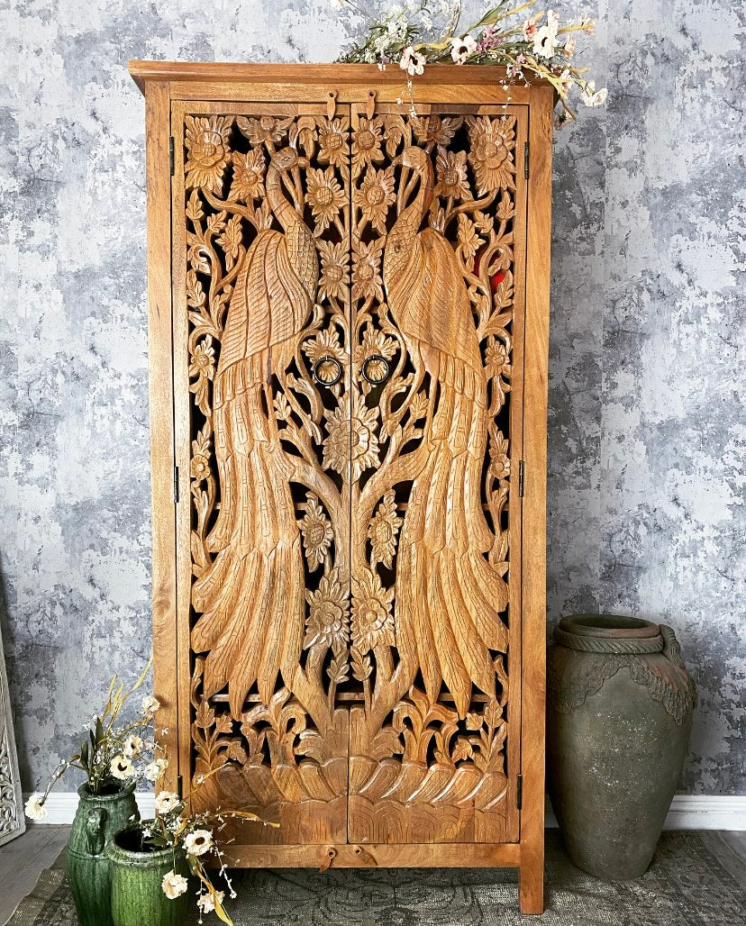 Make a statement with this majestic armoire. Two proud peacocks stand back-to-back amid swirling arabesques, offering generous storage and an instant focal point in a living room or dressing area.