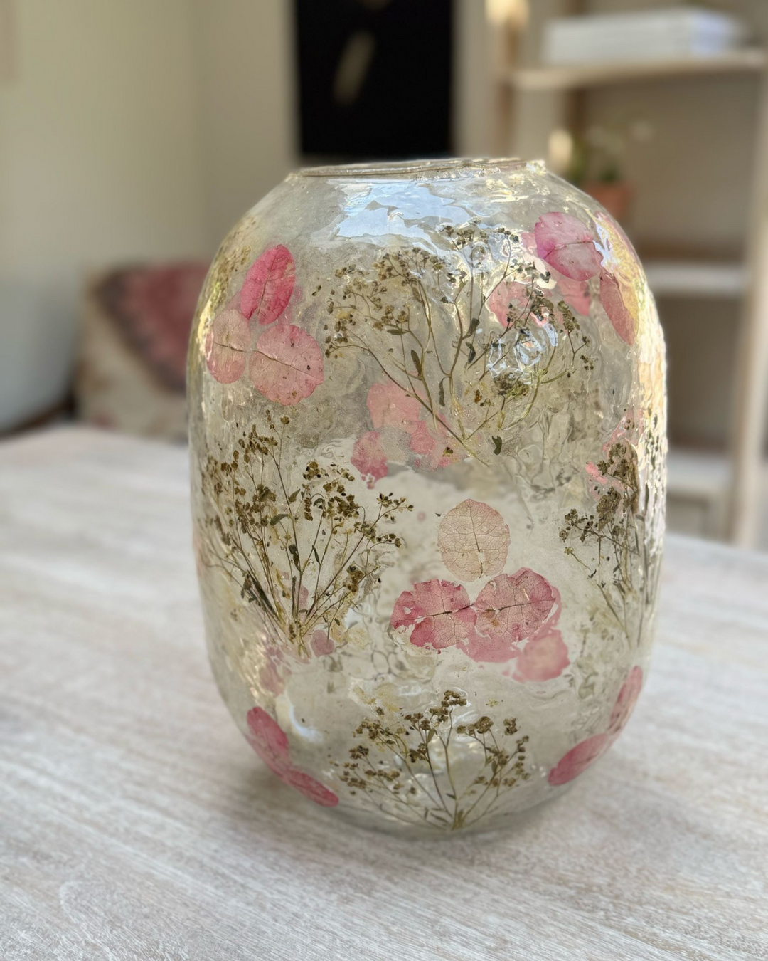 Building on this tradition, our makers have embraced a more contemporary form of creativity: embedding real dried flowers, ferns, and petals directly into recycled glass. As the glass is hand-blown, these delicate natural elements are carefully placed and pressed into the surface, creating a timeless botanical mosaic sealed within the glass itself.