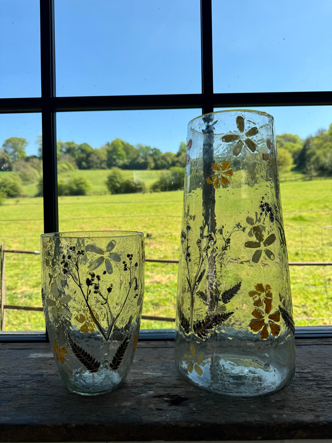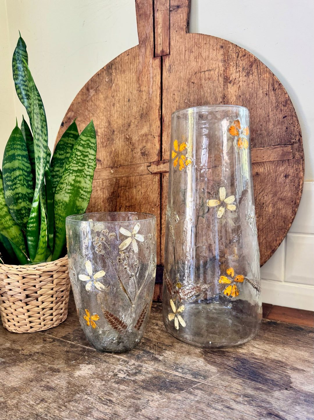 From softly rounded tumblers scattered with blush-toned petals to tall, tapered vases threaded with marigolds and pressed ferns, each item is infused with a wild, botanical spirit. These are pieces that work just as beautifully on a sunlit table as they do styled on a shelf or filled with seasonal stems.