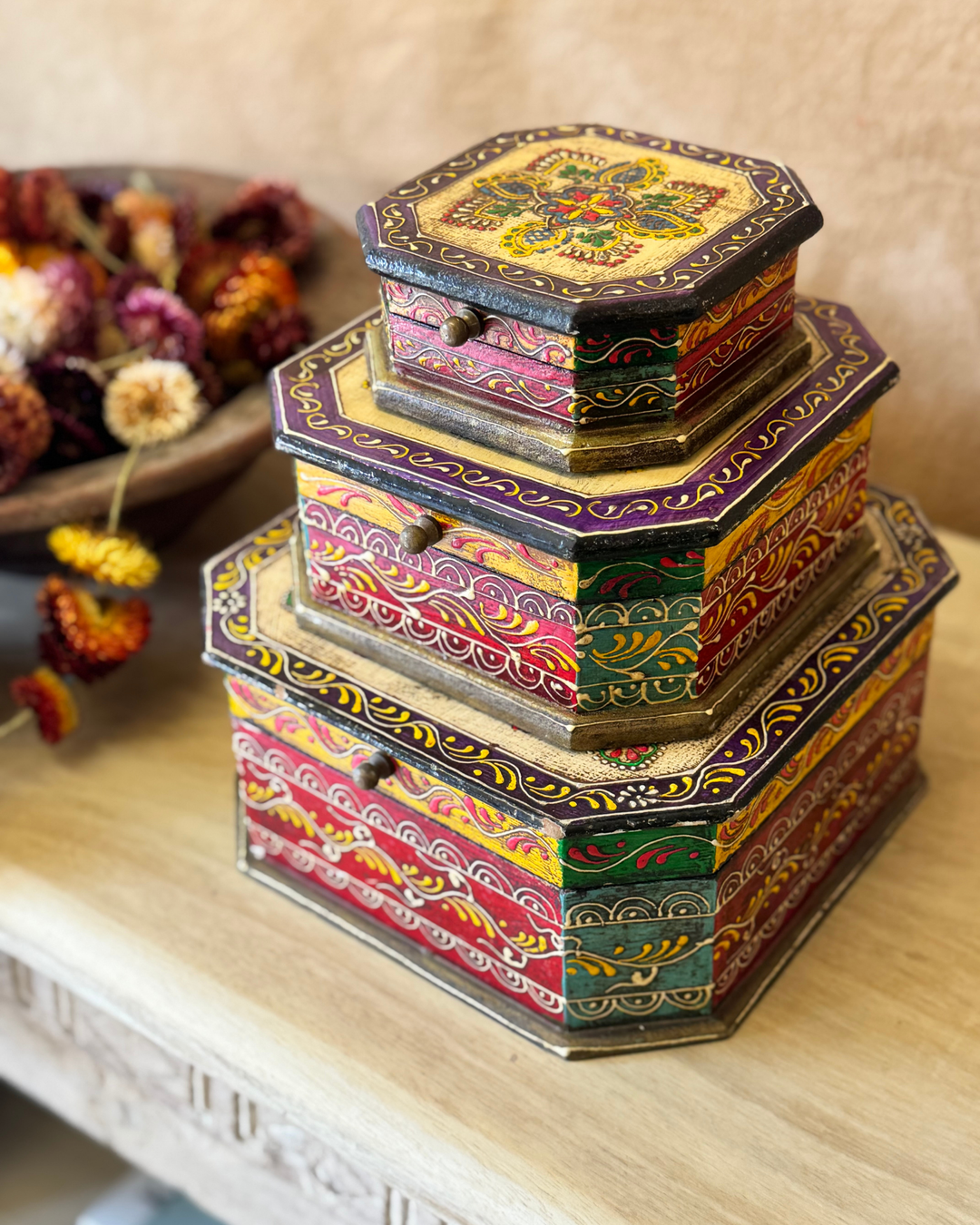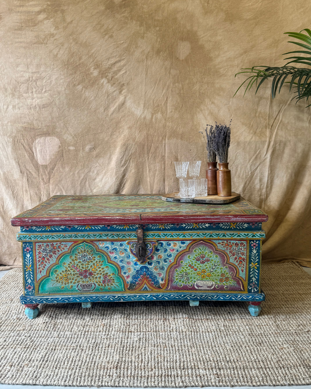 From intricately carved cabinets and sideboards to beautifully detailed blanket chests and coffee tables, our vintage wooden furniture has been transformed by hand. Expect vibrant floral motifs, traditional Indian patterns, and distressed finishes that whisper stories from decades past.
