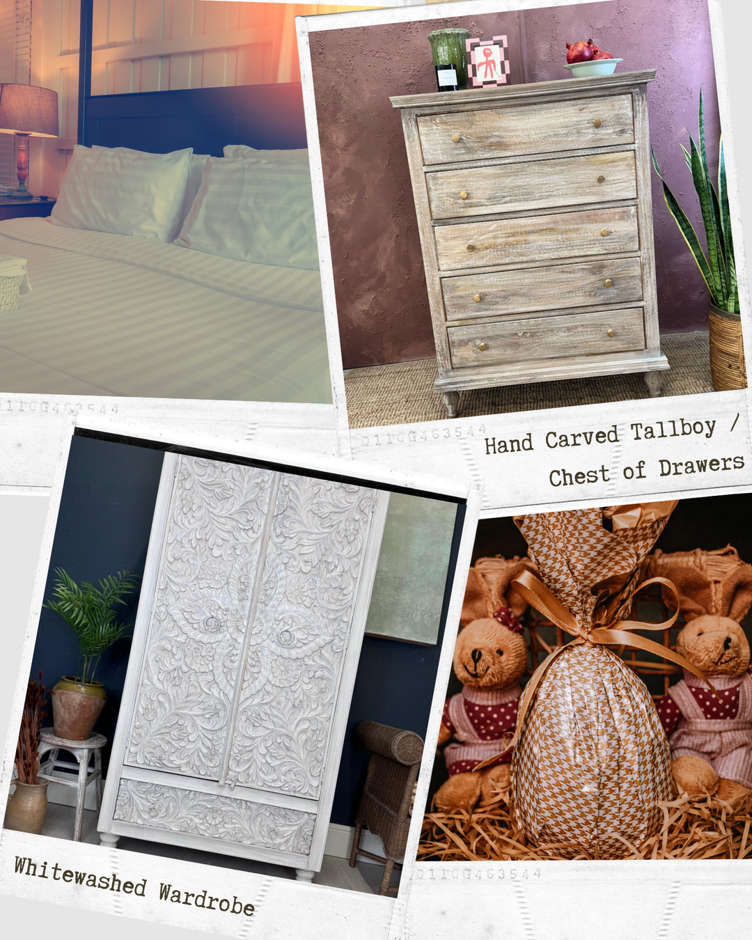 Whitewashed Mango Wood Armoire—a beautifully carved wardrobe with a soft, chalky finish. Its delicate tone lightens the space and adds a touch of artisanal charm.