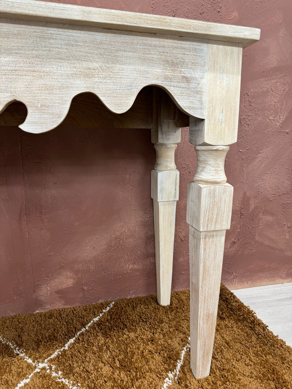 The light cream wash enhances the table's clean, modern lines while highlighting the natural beauty of the wood. Its standout feature is the traditional Indian front design, adding an exquisite cultural touch to its otherwise simple and sleek profile. This fusion of modern simplicity and traditional craftsmanship makes it a versatile addition to any space, perfect for those who appreciate a blend of styles.