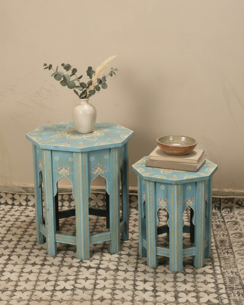 Set of 2 Hand-Painted Octagonal Accent Tables – Turquoise Finish with Floral Motifs