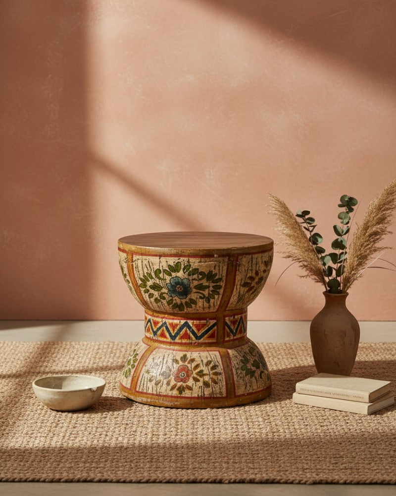 Vintage Hand-Painted Wooden Stool – Reclaimed Timber with Floral Motif