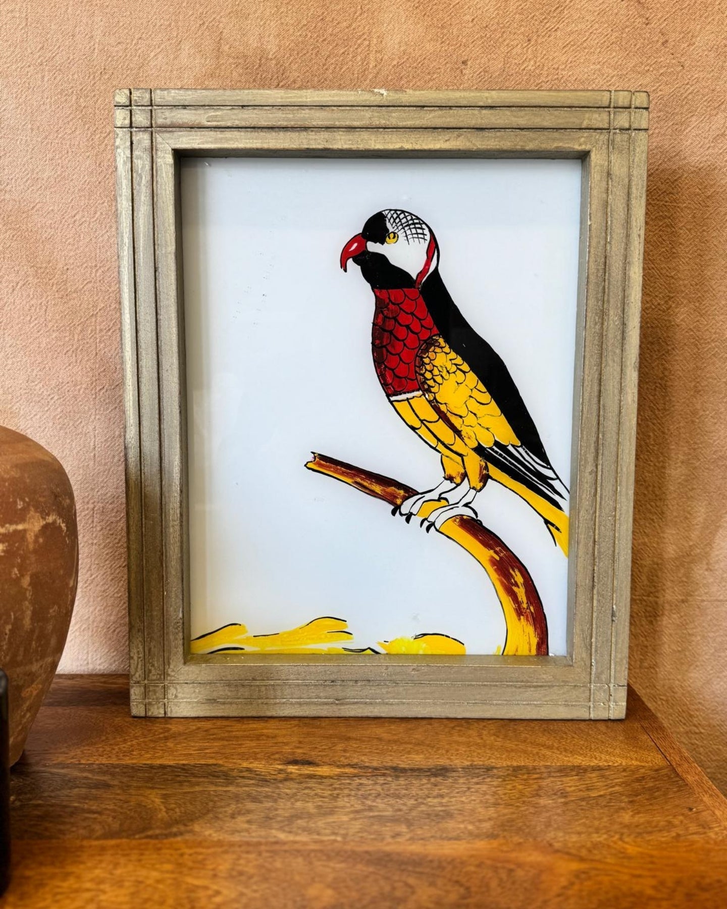 Hand-Painted Indian Reverse Glass Bird Artwork – Mango Wood Frame (Natural Finish, 37 x 45cm)