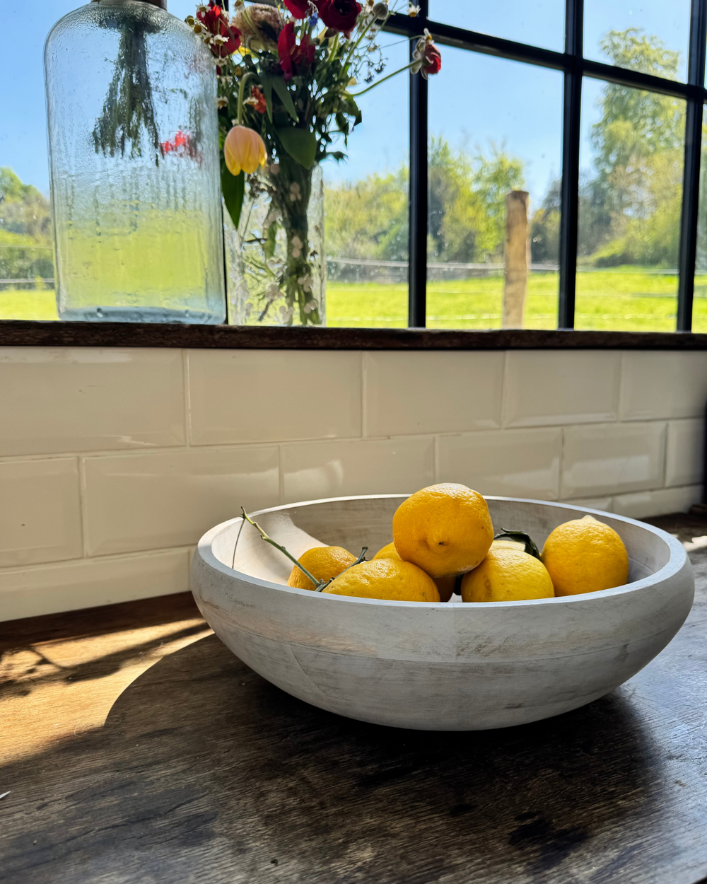 This beautifully simple mango wood fruit bowl is hand-carved and lightly whitewashed to create a fresh, rustic aesthetic that blends seamlessly with both modern and traditional interiors. Its rounded form and shallow depth make it ideal for holding lemons, limes, or dried botanicals, while the soft, matte finish highlights the natural wood grain beneath.