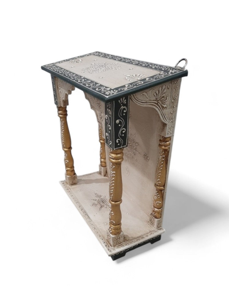 This compact mango wood Mandir brings together spiritual elegance and artisan craftsmanship in a space-saving form. Painted in a deep forest green with gold highlights, it features intricate mandala etchings and finely carved detailing. The traditional arched canopy and hand-turned columns create a beautiful frame for your idols or sacred objects. Perfectly sized for console tables, shelves, or corners, this Mandir also includes a small drawer to keep your pooja essentials neatly tucked away.