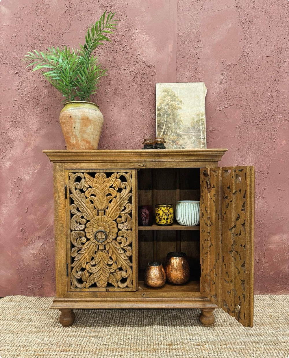 Bring timeless charm and cultural heritage into your home with this beautifully hand-carved mango wood sideboard. Lovingly crafted by skilled artisans in India, each piece features intricately carved floral motifs across the front, offering a unique blend of tradition and elegance.