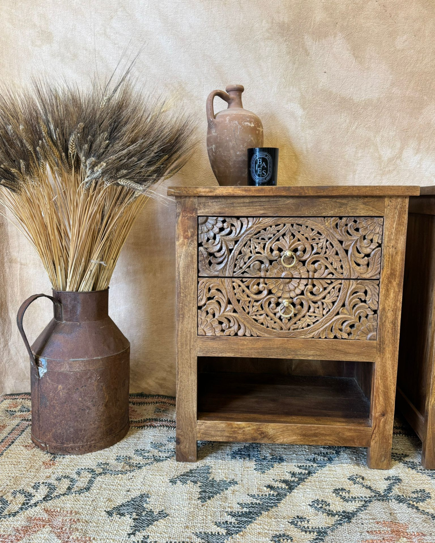 Pair of Mango Wood Bedside Tables – Intricate Floral Carved Design
