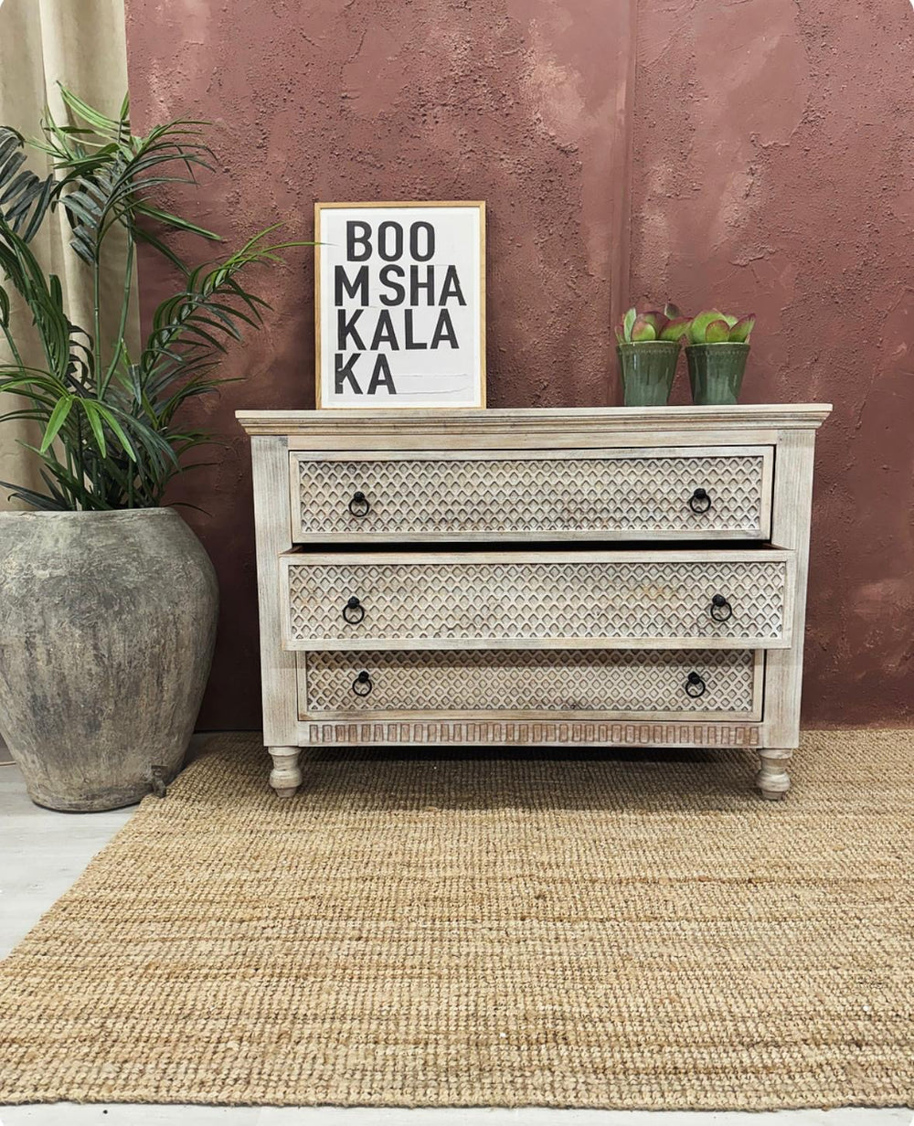 Hand-Carved Mango Wood Three Drawer Chest – Jali Design in Creamwash Finish