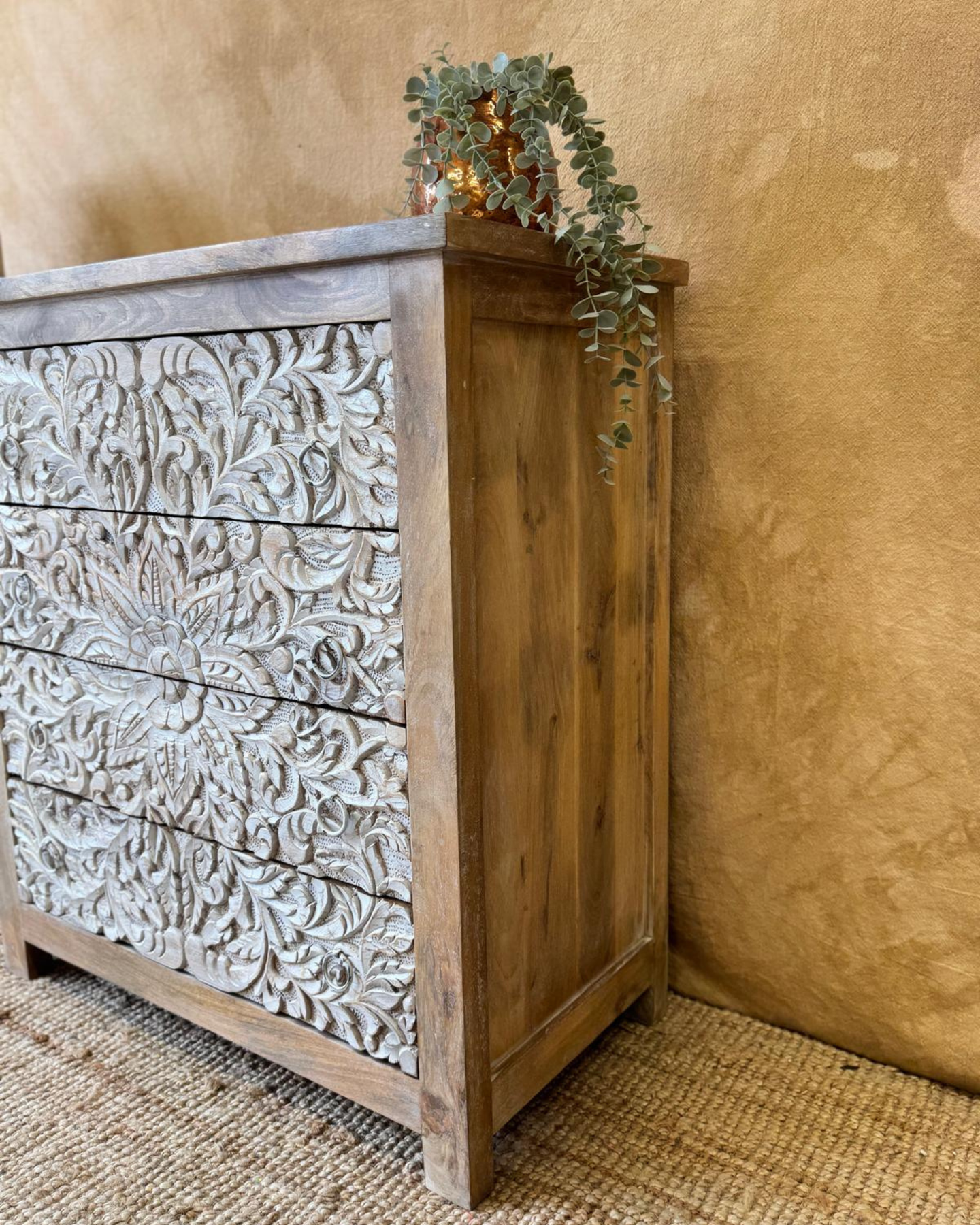 Bring warmth and artistry into your home with this exquisite Hand-Carved Mango Wood Chest of Drawers. Expertly crafted from sustainably sourced solid mango wood, each drawer front is adorned with intricate floral carvings, beautifully enhanced by a whitewashed finish that highlights every delicate detail. The surrounding frame is polished to a soft natural tone, creating a perfect balance of rustic charm and refined craftsmanship.