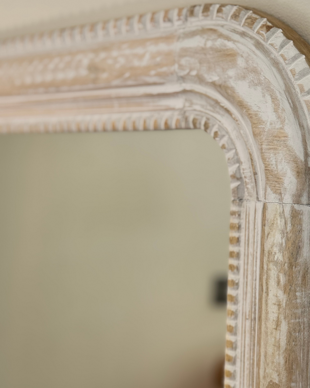 Understated yet beautifully detailed, this full-length mirror is hand-carved from solid mango wood and finished with a soft whitewash that enhances its artisanal character. The subtly rounded corners are framed by a beaded-style carved edge—offering structure and elegance without overpowering its natural charm.