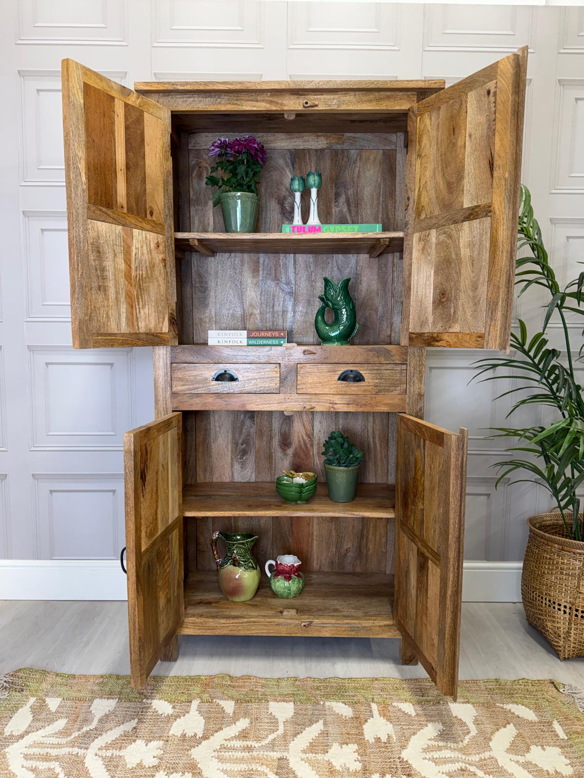 Inside, multiple shelves offer versatile storage for linens, tableware, clothing or pantry essentials. The addition of two central drawers provides convenient space for smaller items, helping you keep your home beautifully organised.