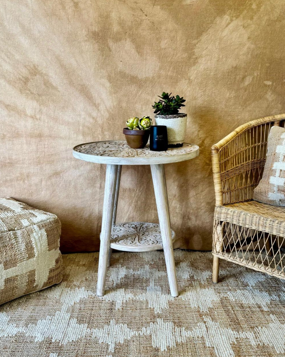 Hand-Carved Mango Wood Circular Side Table with Shelf – Creamwash Floral Design