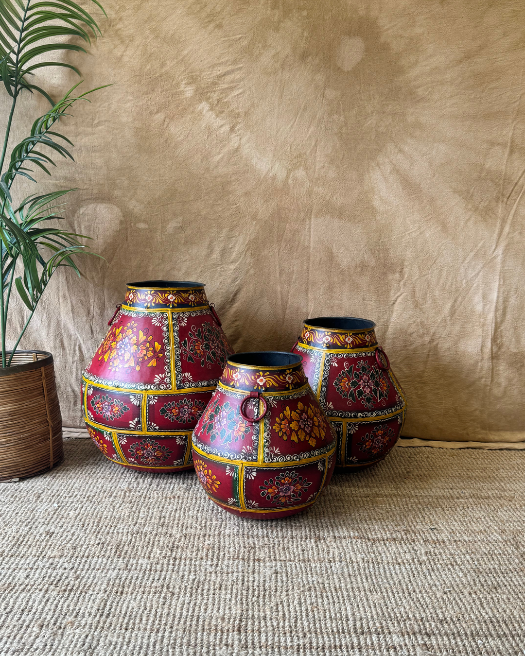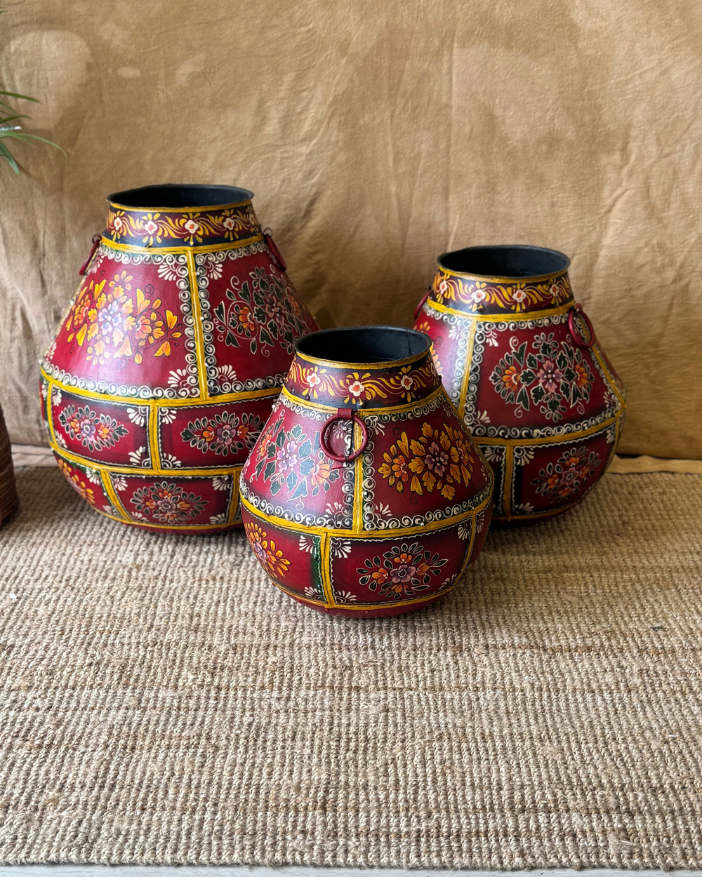 Hand-Painted Vintage Iron Pots – Red Floral Motif | Reclaimed Set of 3
