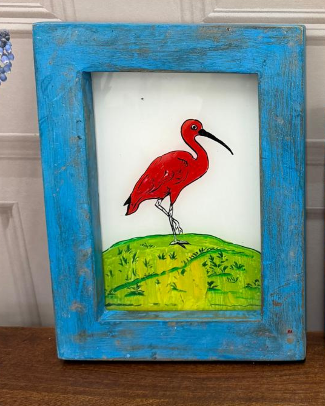 Hand-Painted Indian Reverse Glass Bird Artwork – Mango Wood Frame (Whitewashed, 37 x 45cm)