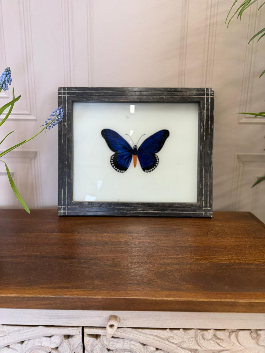 Hand-Painted Blue Butterfly Oil Painting – Reclaimed Mango Wood Frame (37 x 45 cm)