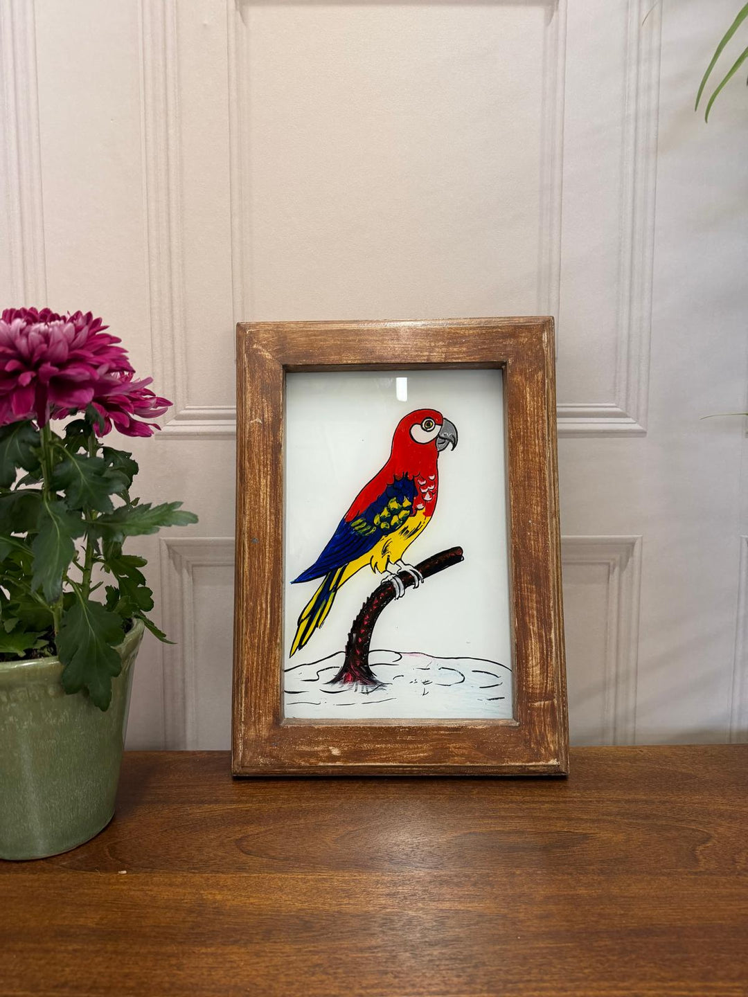 Hand-Painted Parrot Oil Painting – Reclaimed Mango Wood Frame (37 x 45 cm)