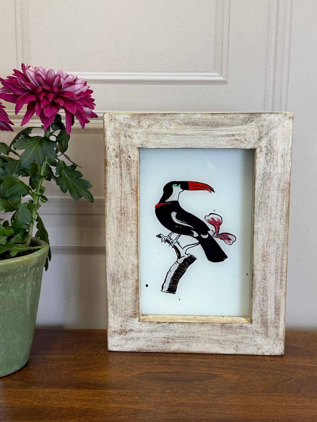 Hand-Painted Toucan Artwork – Whitewashed Mango Wood Frame (22 x 29 cm)