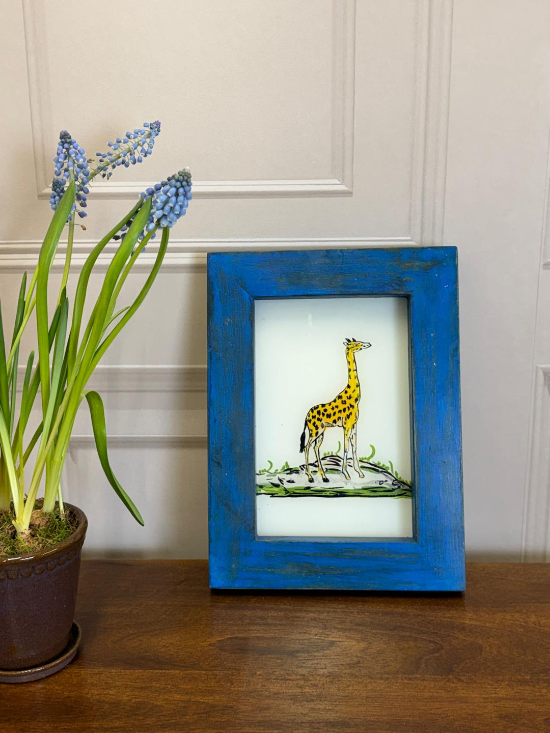 Hand-Painted Giraffe Artwork – Blue Reclaimed Mango Wood Frame (22 x 29 cm)