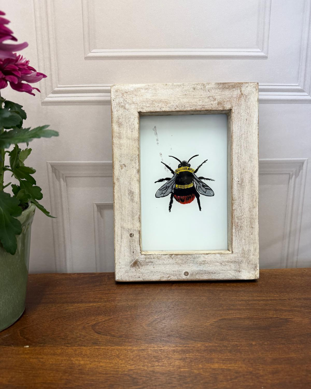 Hand-Painted Bee Oil Painting – Whitewashed Reclaimed Wood Frame (22 x 29 cm)