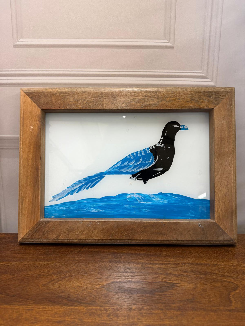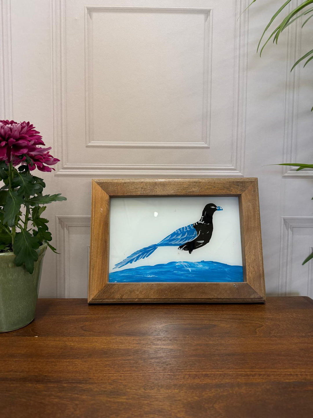 Hand-Painted Blue Bird Oil Painting – Reclaimed Mango Wood Frame (27 x 37 cm)