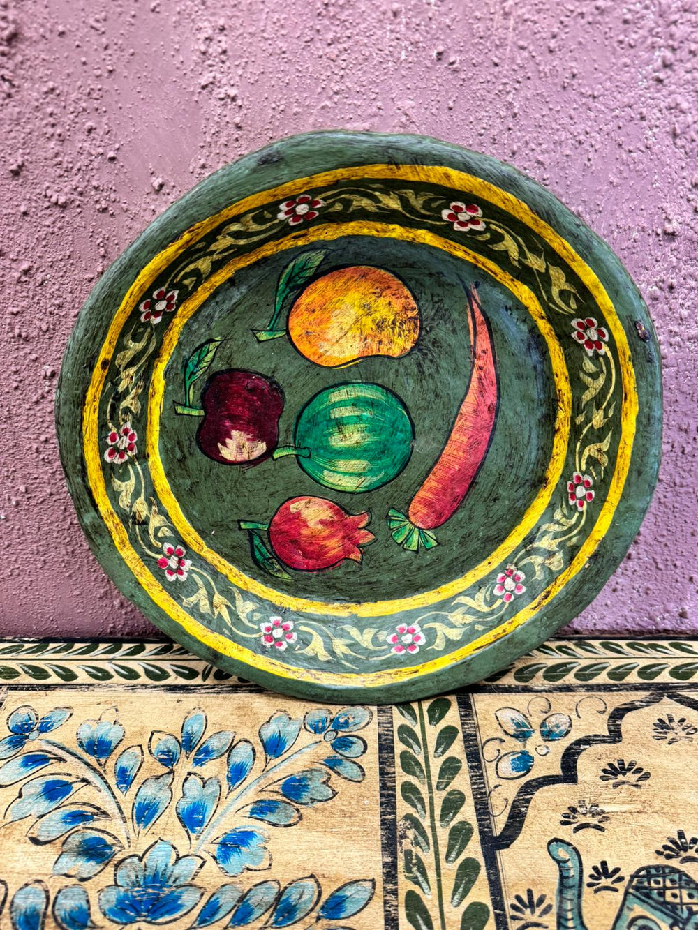Embrace the tradition and history of Indian craftsmanship with these beautifully hand-painted paper mâché bowls. Crafted by skilled artisans, each bowl showcases intricate designs of fruits and vegetables, highlighted by a stunning green background that enhances any decor. This paper mâché process, deeply rooted in Indian heritage, especially flourishes in regions like Kashmir, where artisans pass down these techniques through generations. By incorporating these bowls into your space, you not only add a unique and sustainable piece but also support the preservation of traditional craftsmanship.