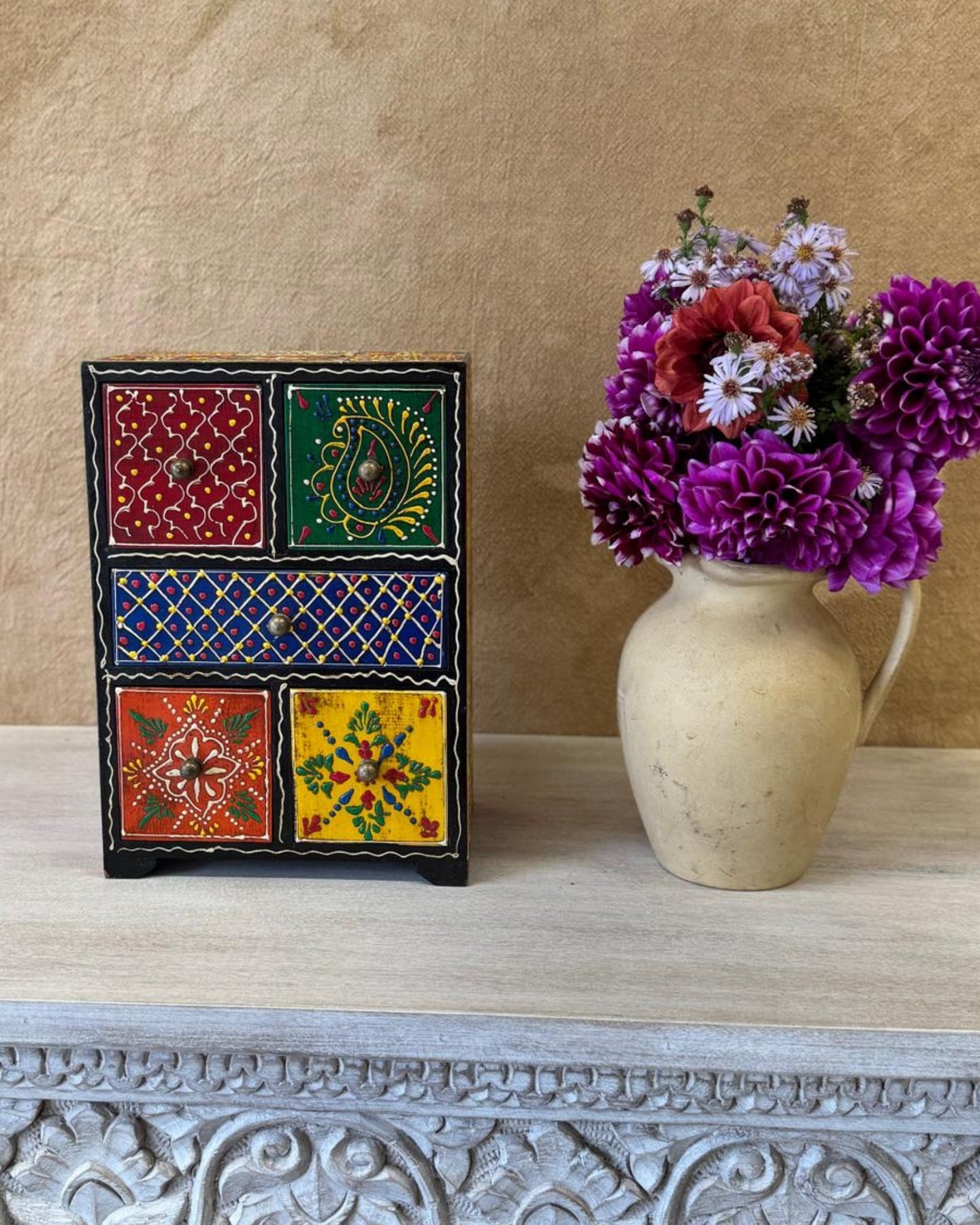 A perfect blend of artistry and practicality, the compact vertical design allows for generous storage while taking up minimal surface space. Ideal for storing jewellery, accessories, or small treasures, each drawer opens smoothly and is finished with a charming painted motif unique to its section.