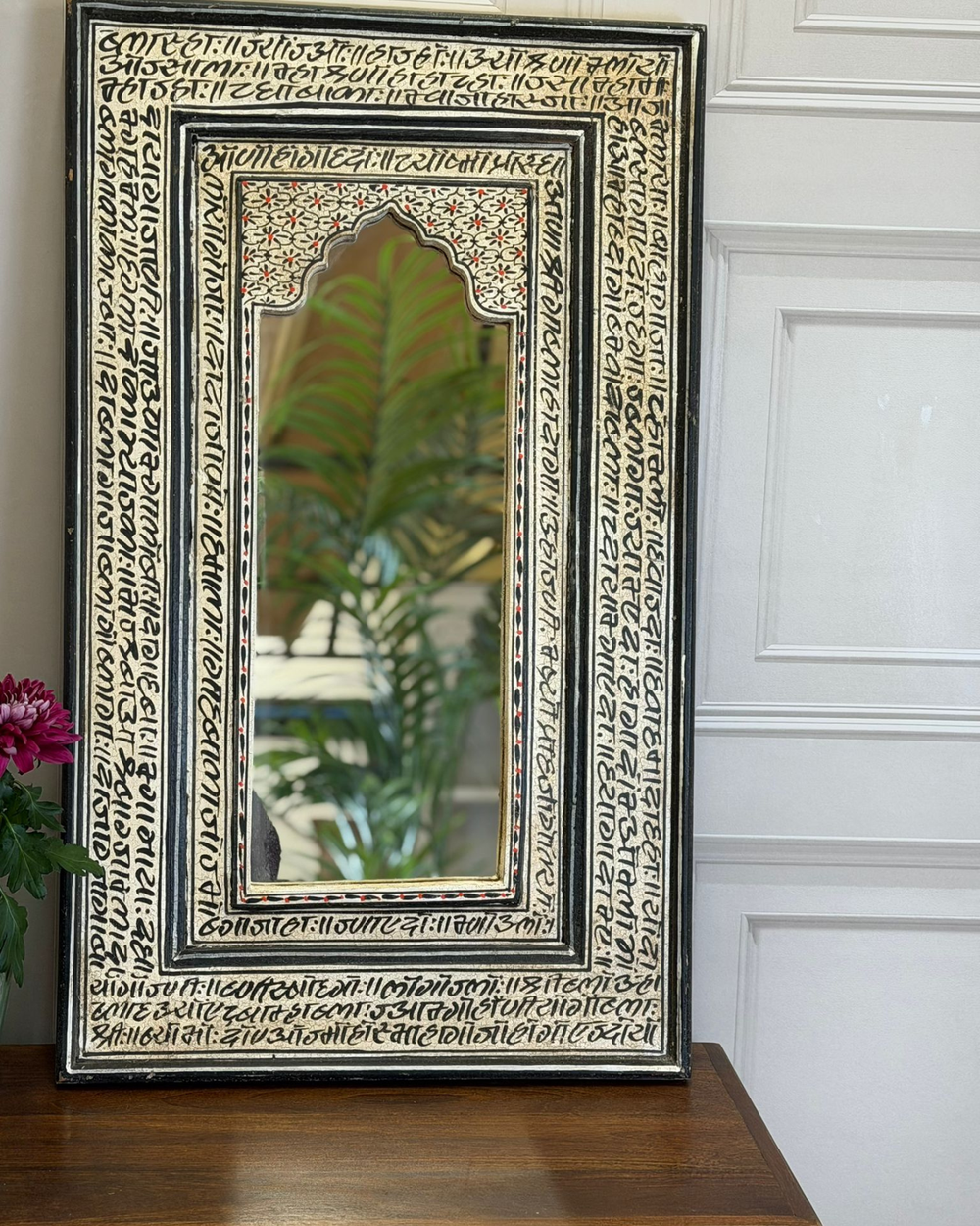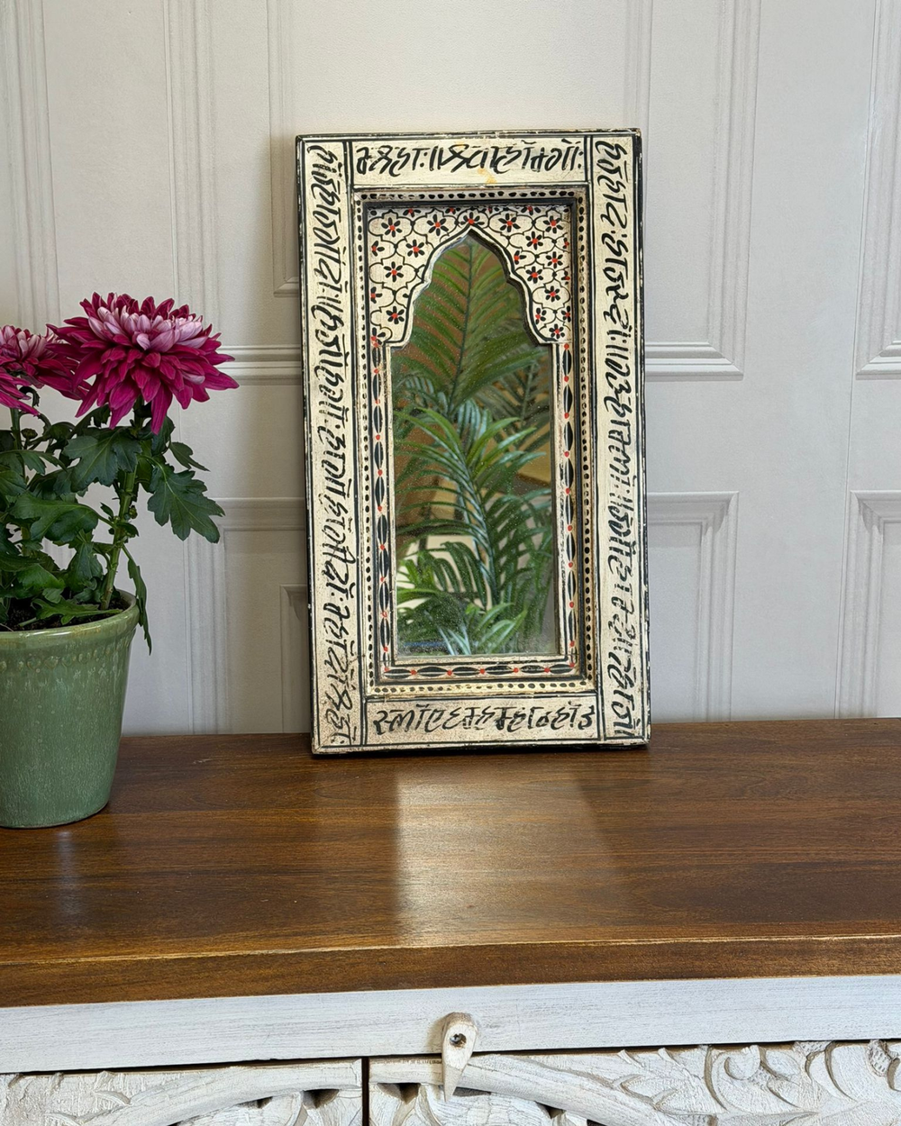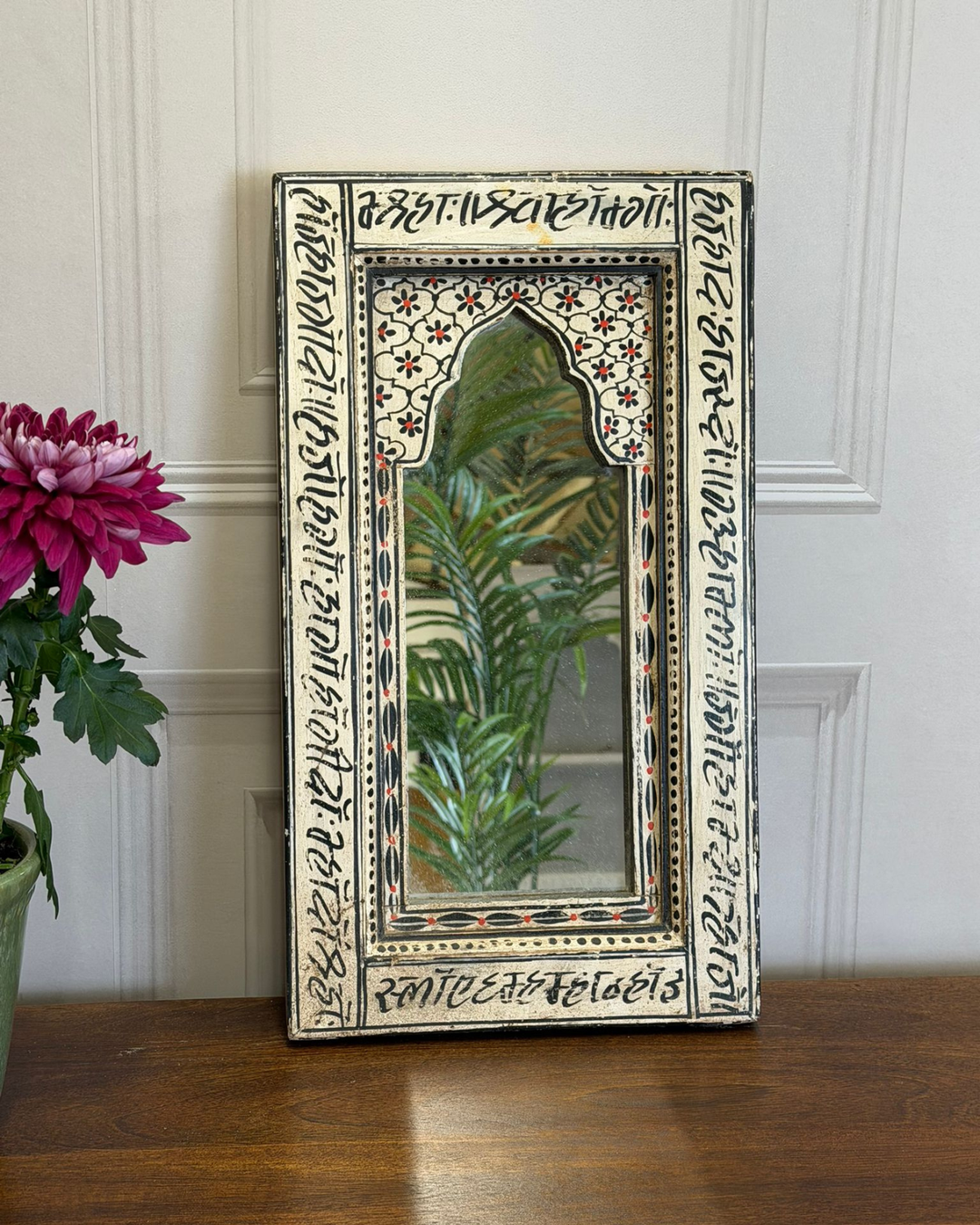 Hand-Painted Vintage Mango Wood Mirror – Black & Cream Script Arched Design (58 x 38 cm)