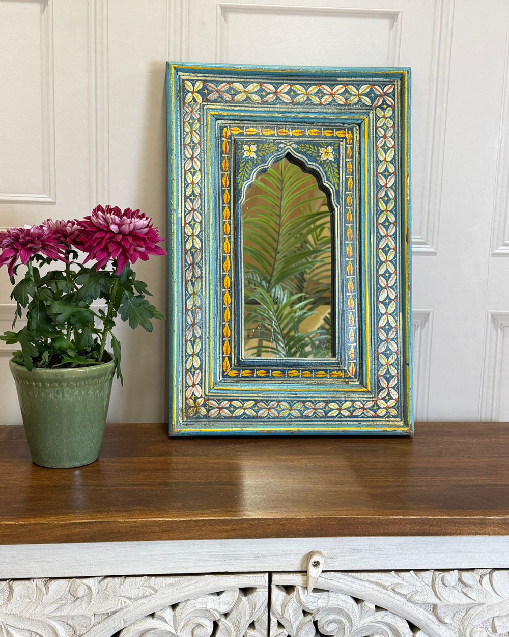 Hand-Painted Vintage Mango Wood Mirror – Blue & Yellow Arched Floral Design (58 x 38 cm)