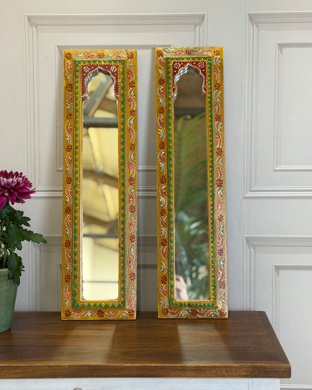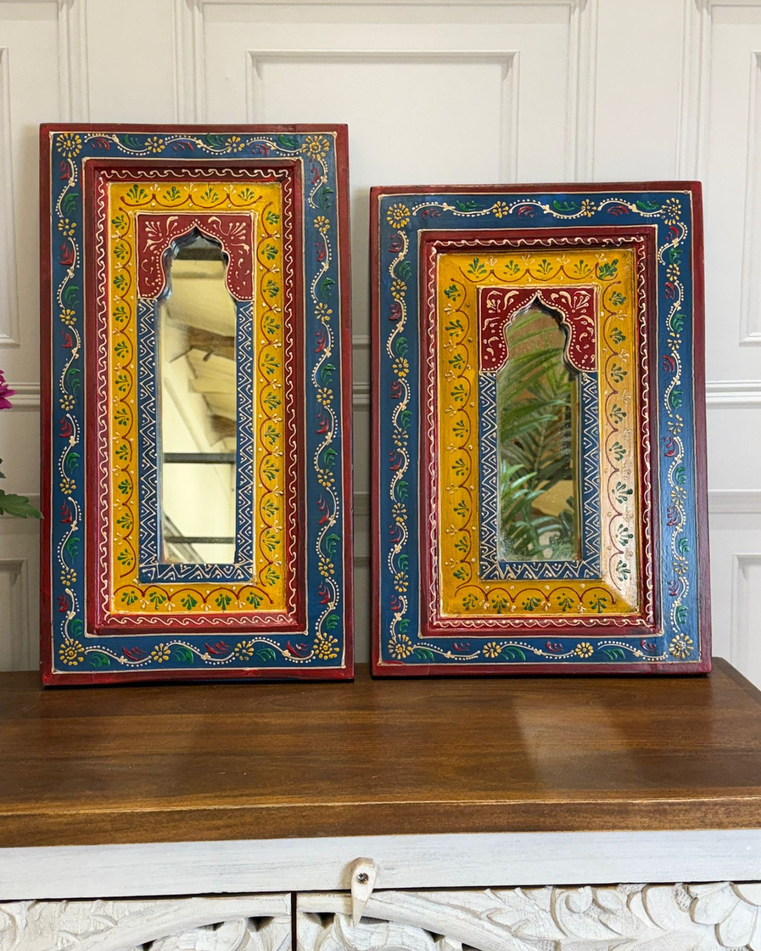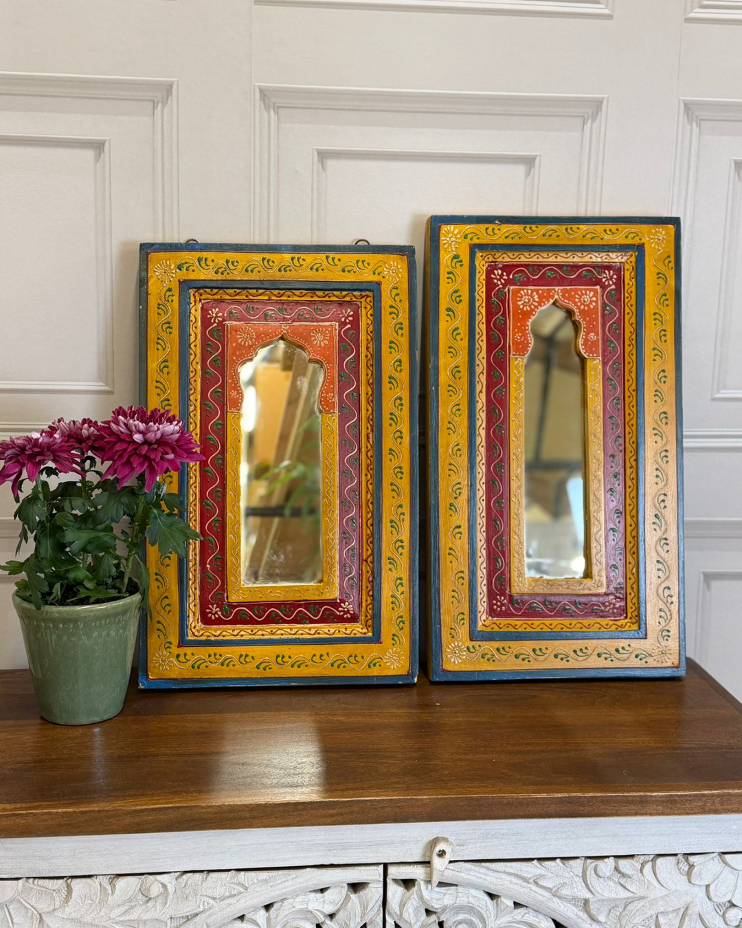 Pair of Hand-Painted Vintage Mango Wood Mirrors – Multicolour Arched Design