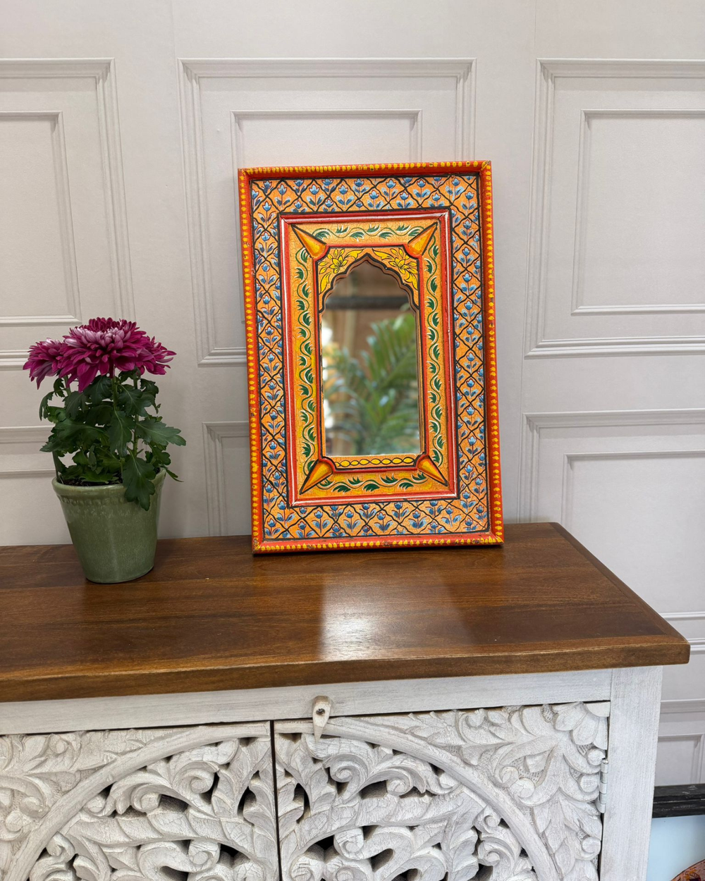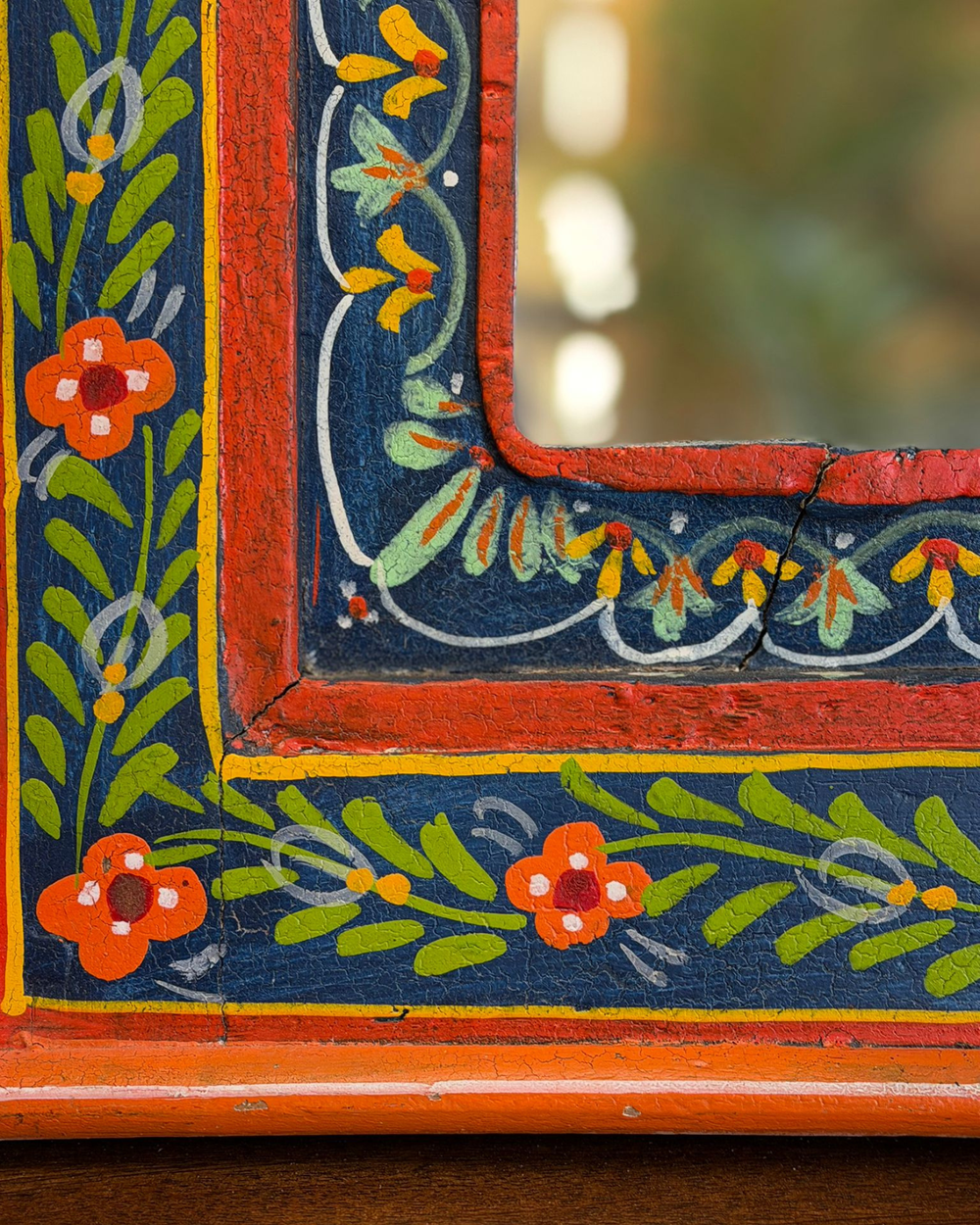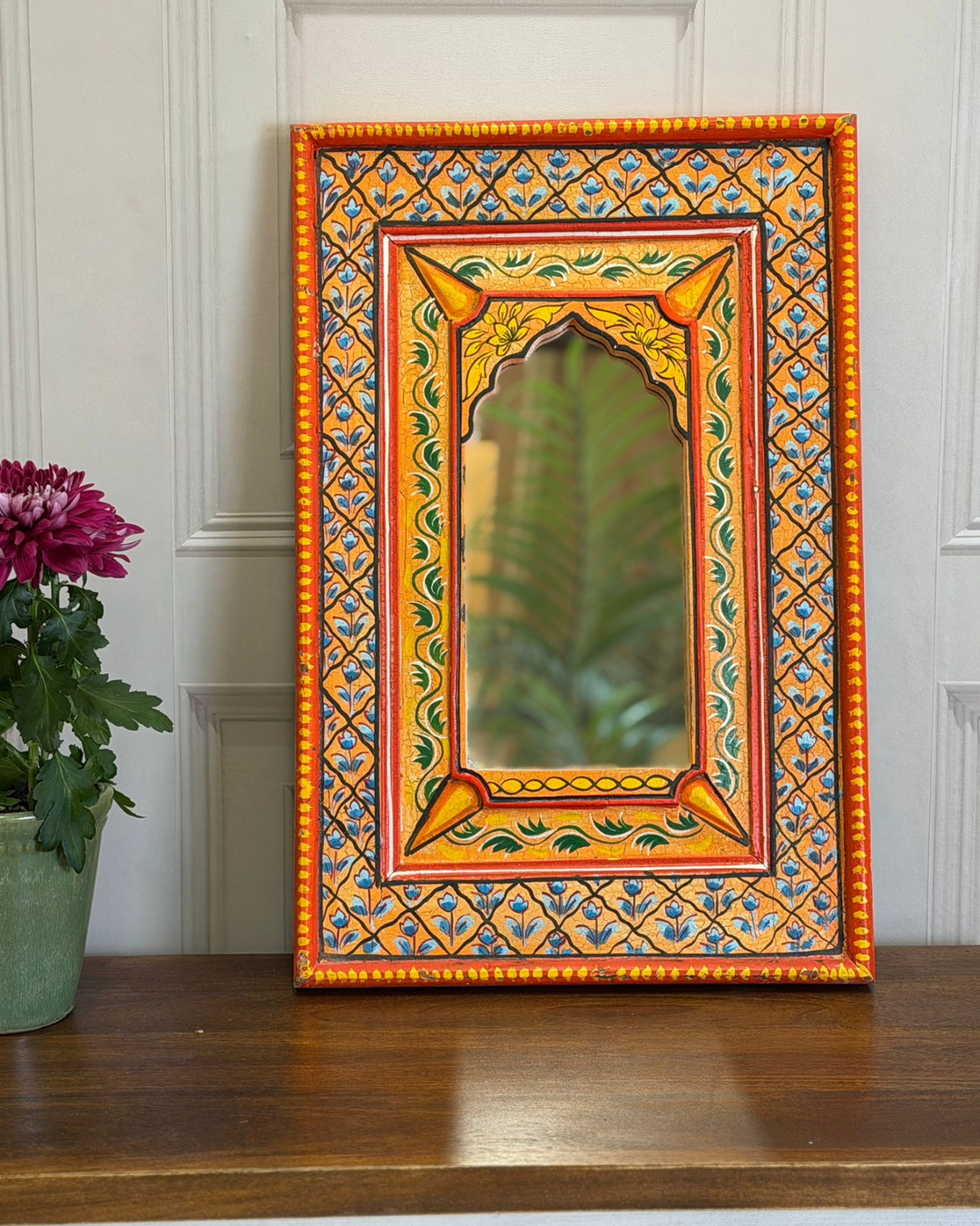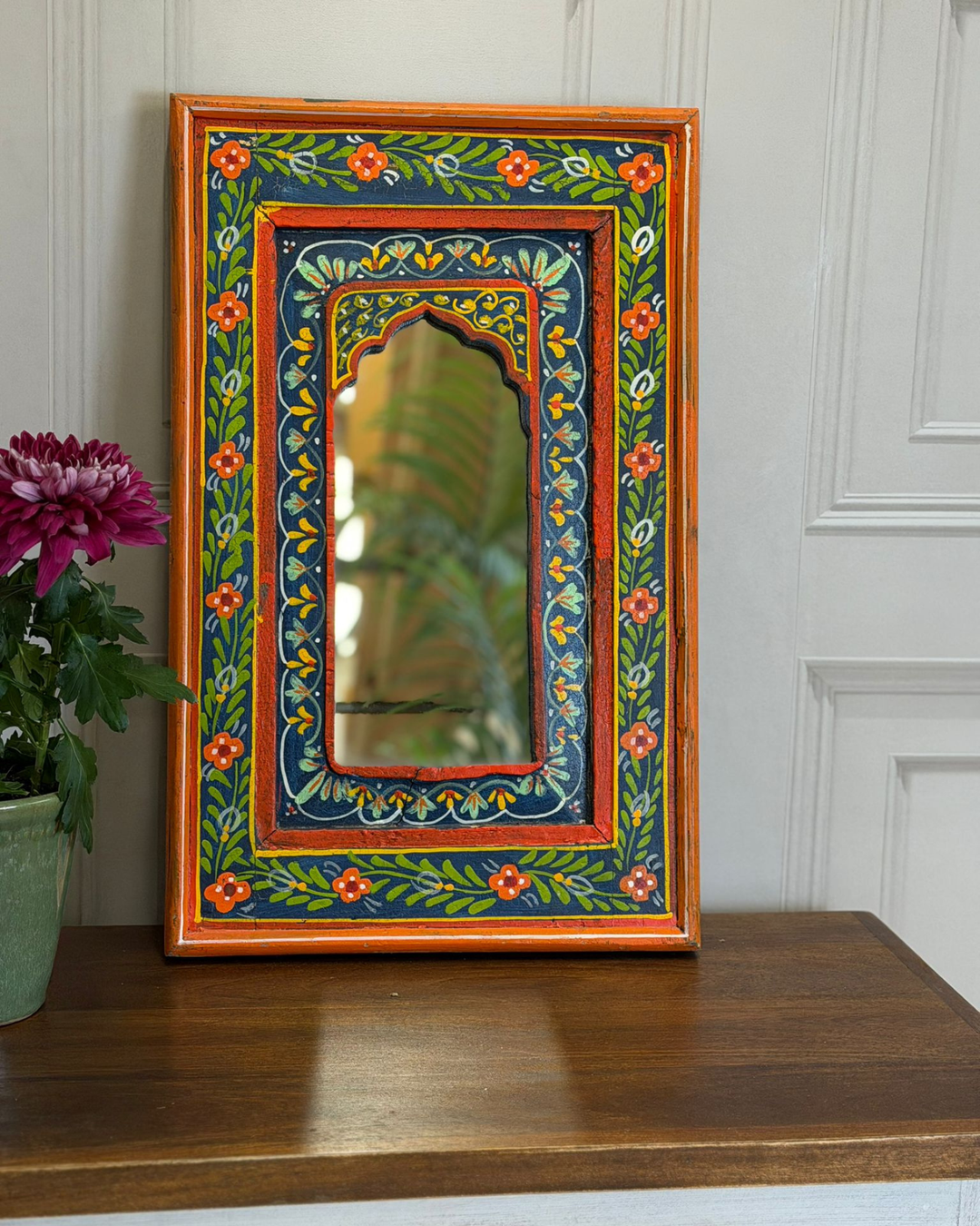Hand-Painted Mango Wood Mirror – Orange & Blue Floral Frame (58 x 38 x 4 cm)