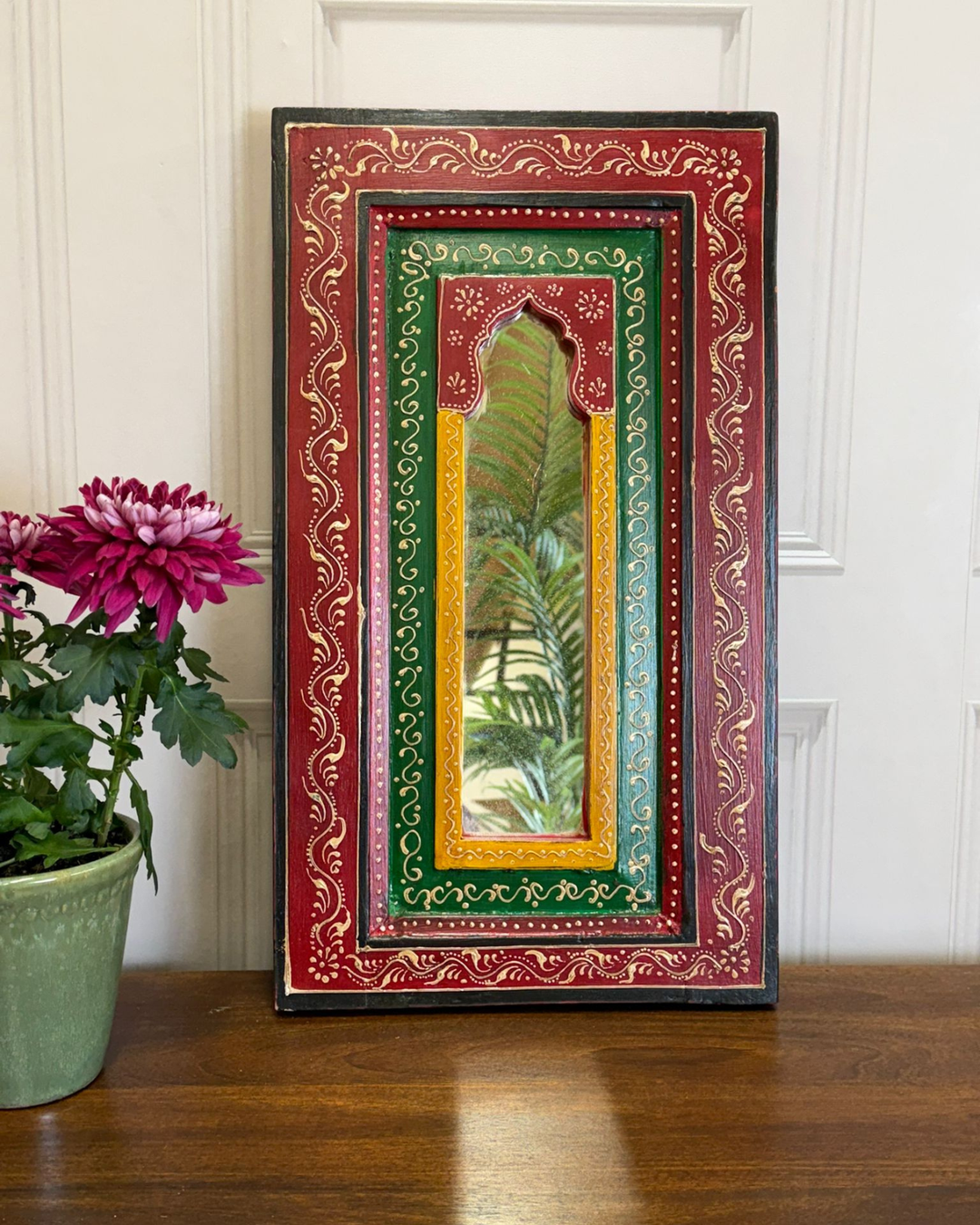 Pair of Hand-Painted Vintage Mango Wood Mirrors – Red & Green Arched Design (Mixed Sizes)