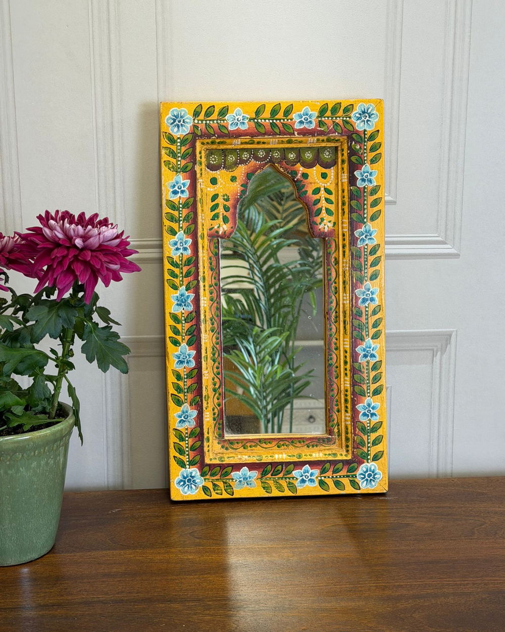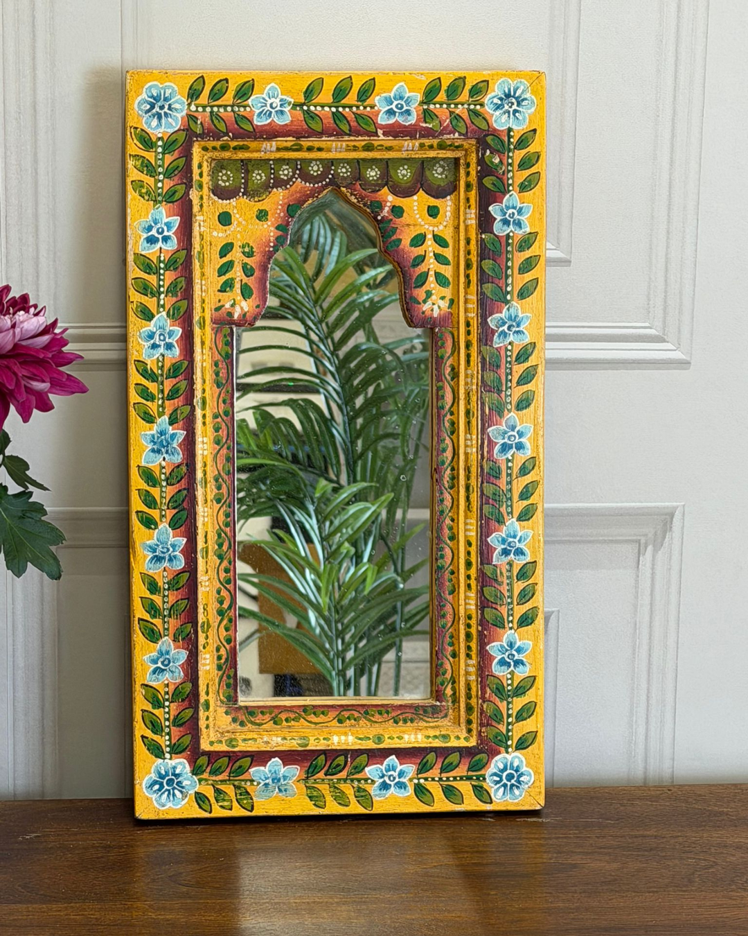 Hand-Painted Vintage Mango Wood Mirror – Yellow Floral Arched Design (58 x 38 cm)