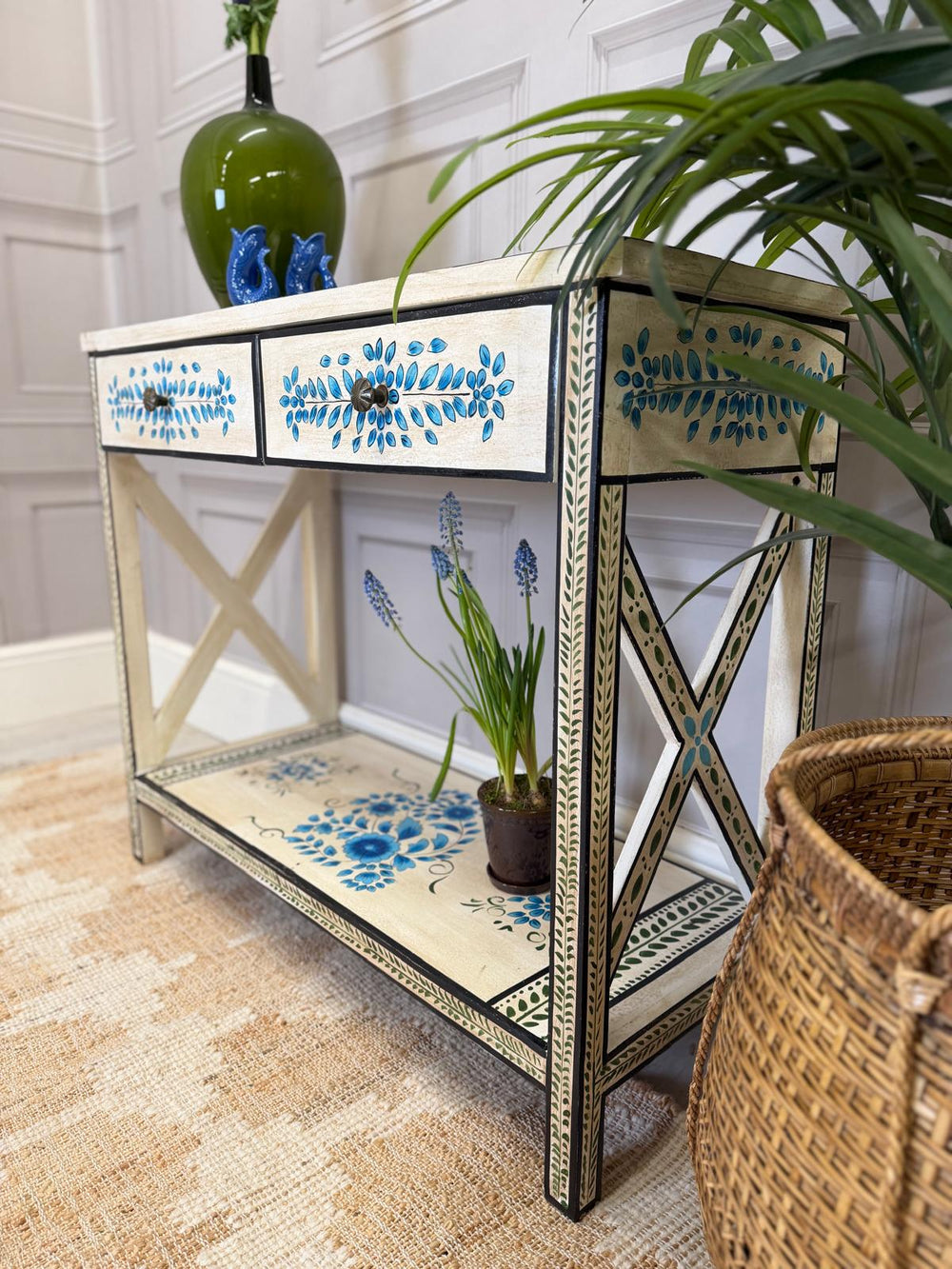 Hand-Painted Console Table – Cream Finish with Turquoise Floral Detailing & 2 Drawers