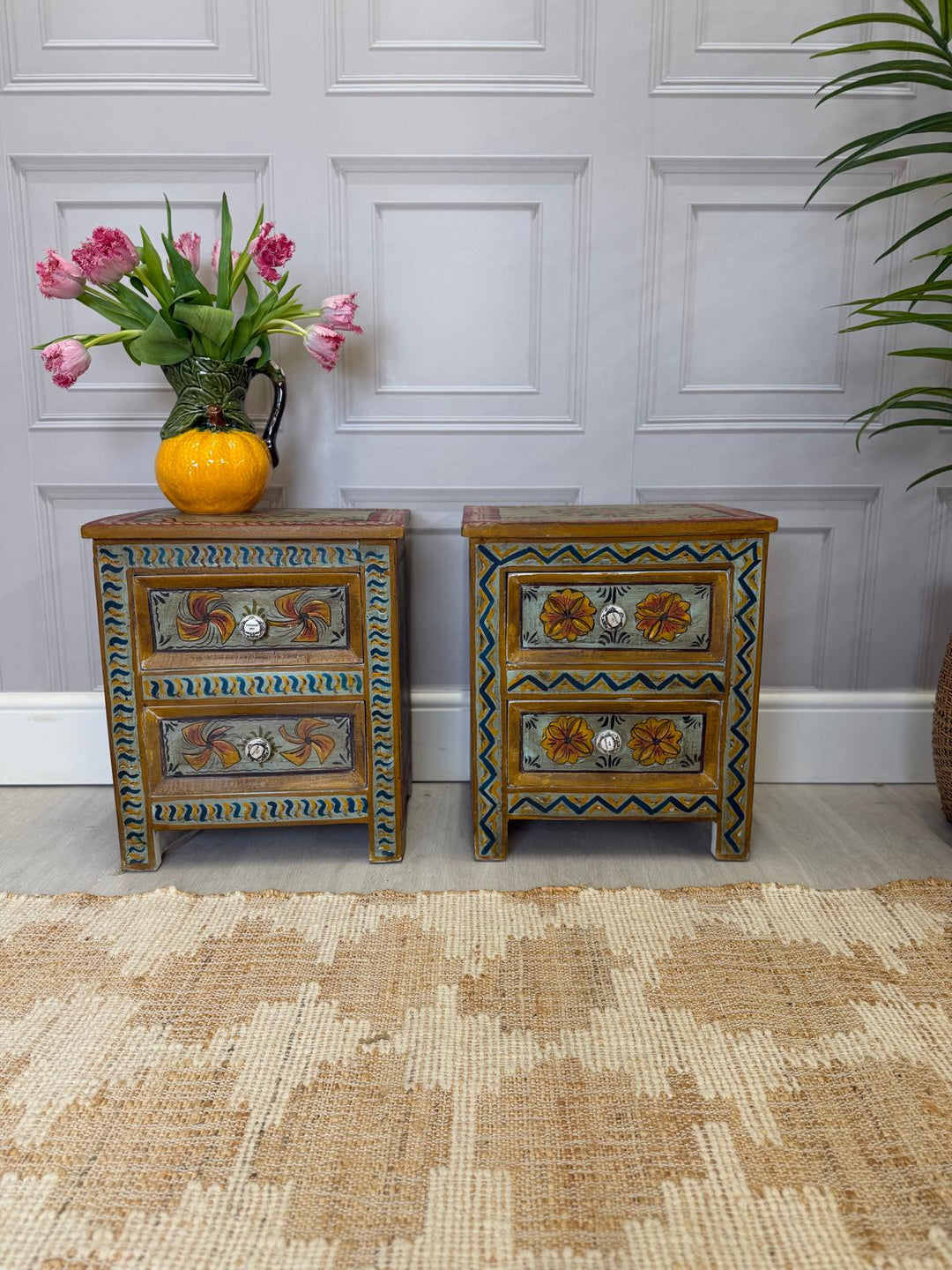 Pair of Hand-Painted Reclaimed Bedside Tables – 2 Drawers with Floral Motif