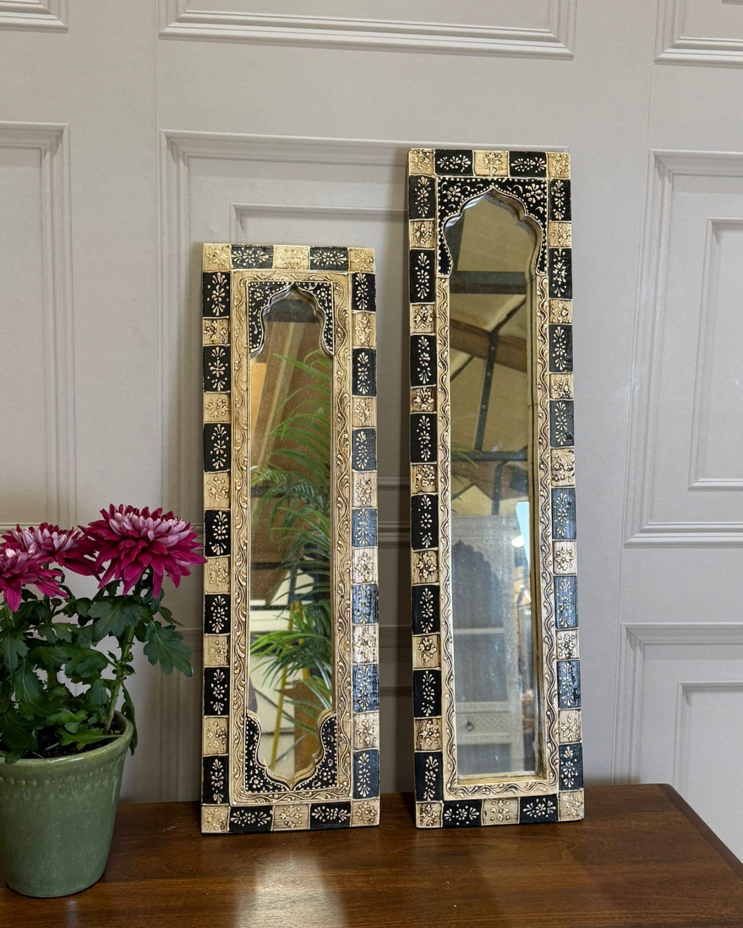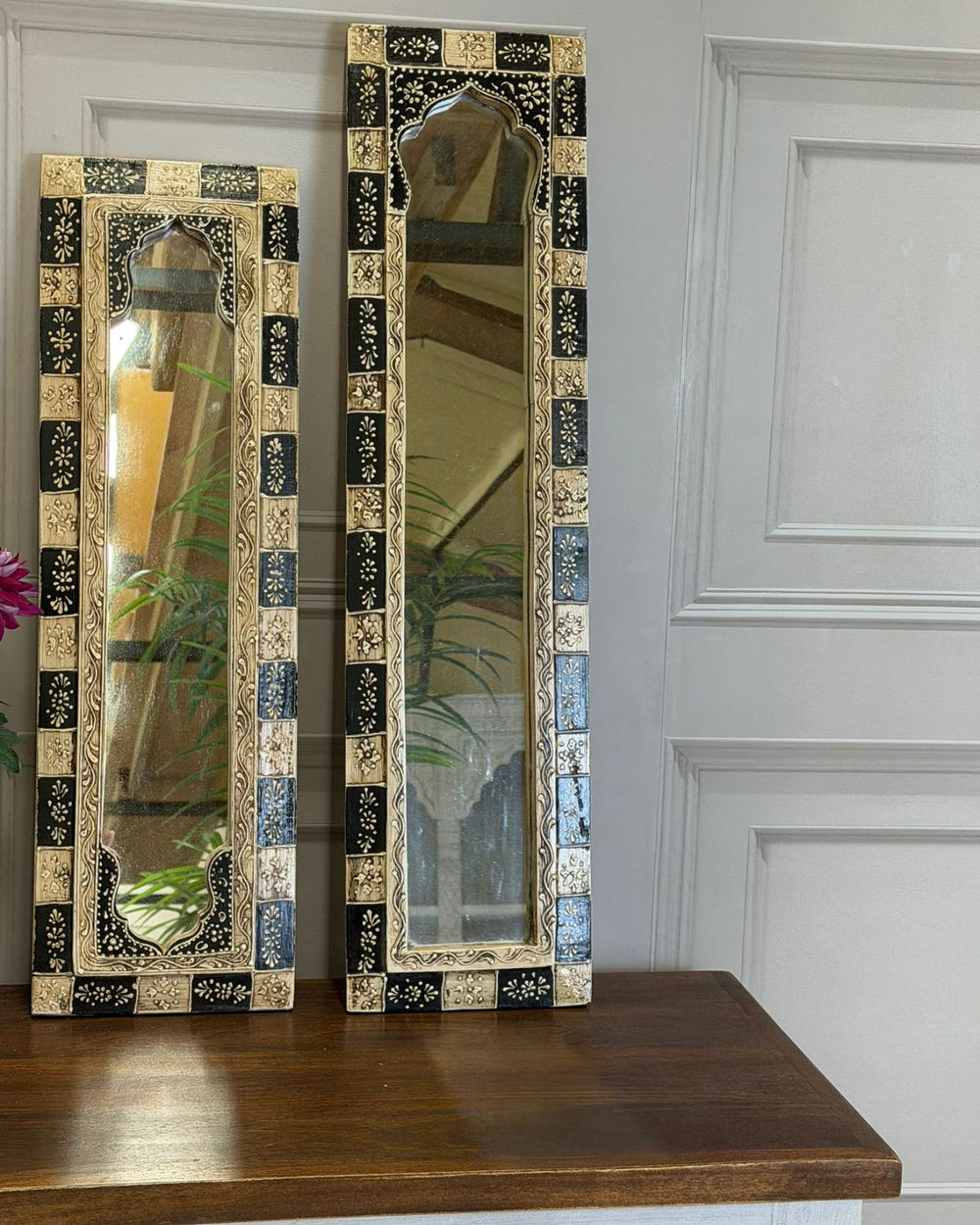 Pair of Hand-Painted Vintage Reclaimed Mango Wood Mirrors – Hand-Carved Arched Frames (60 x 25 cm)