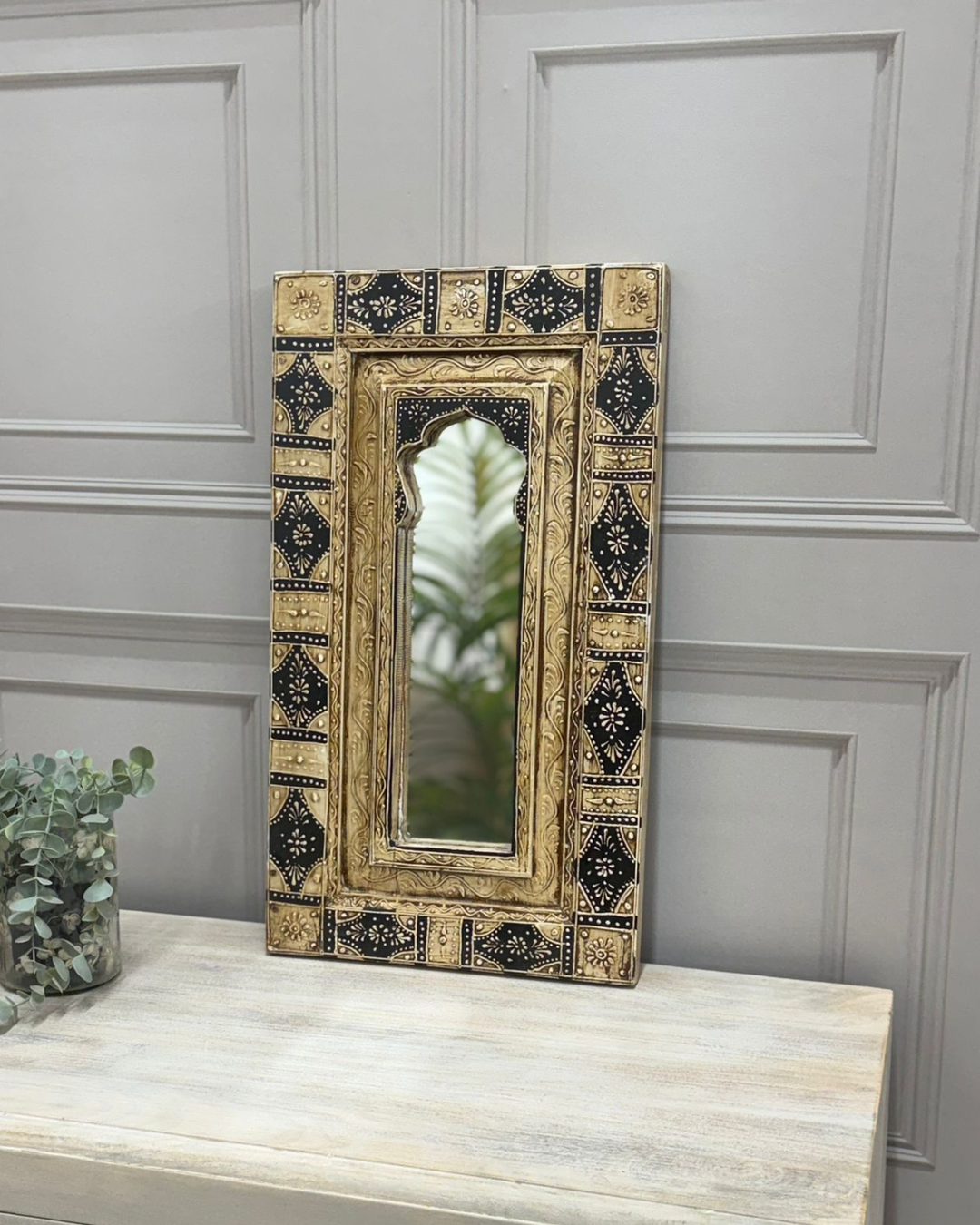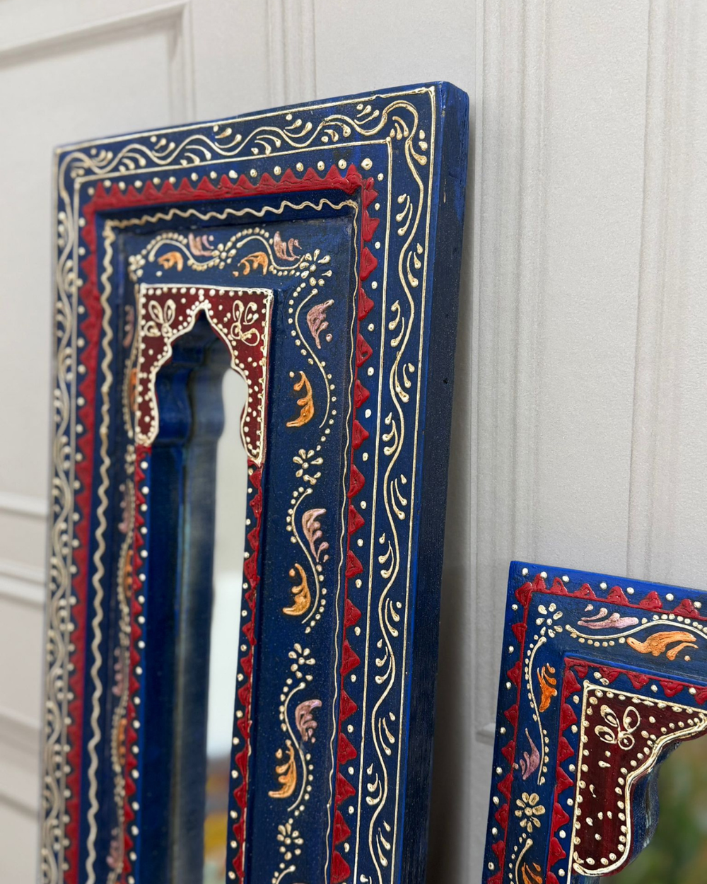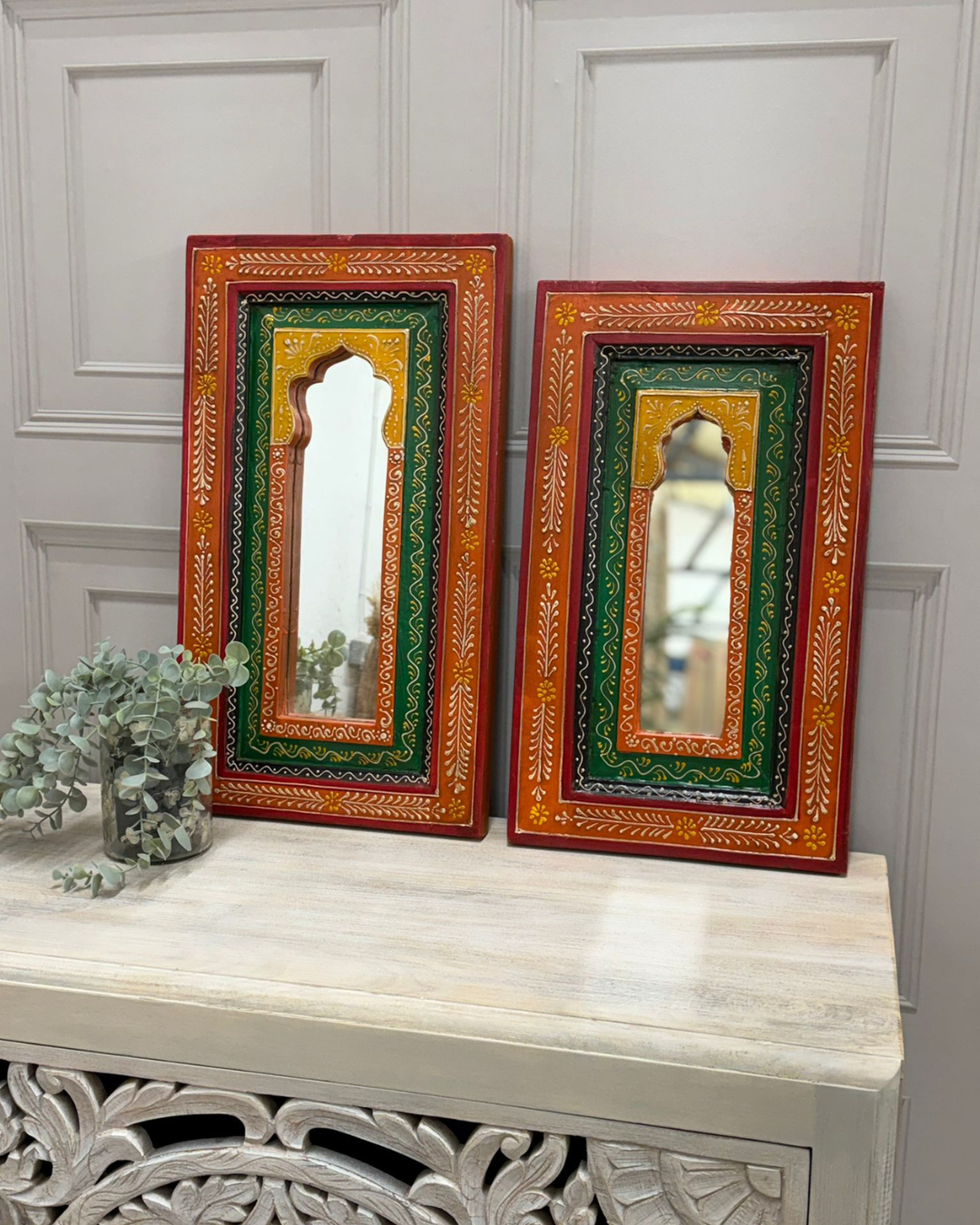 Pair of Hand-Painted Vintage Reclaimed Mango Wood Mirrors – Hand-Carved Arched Frames (60 x 25 cm)