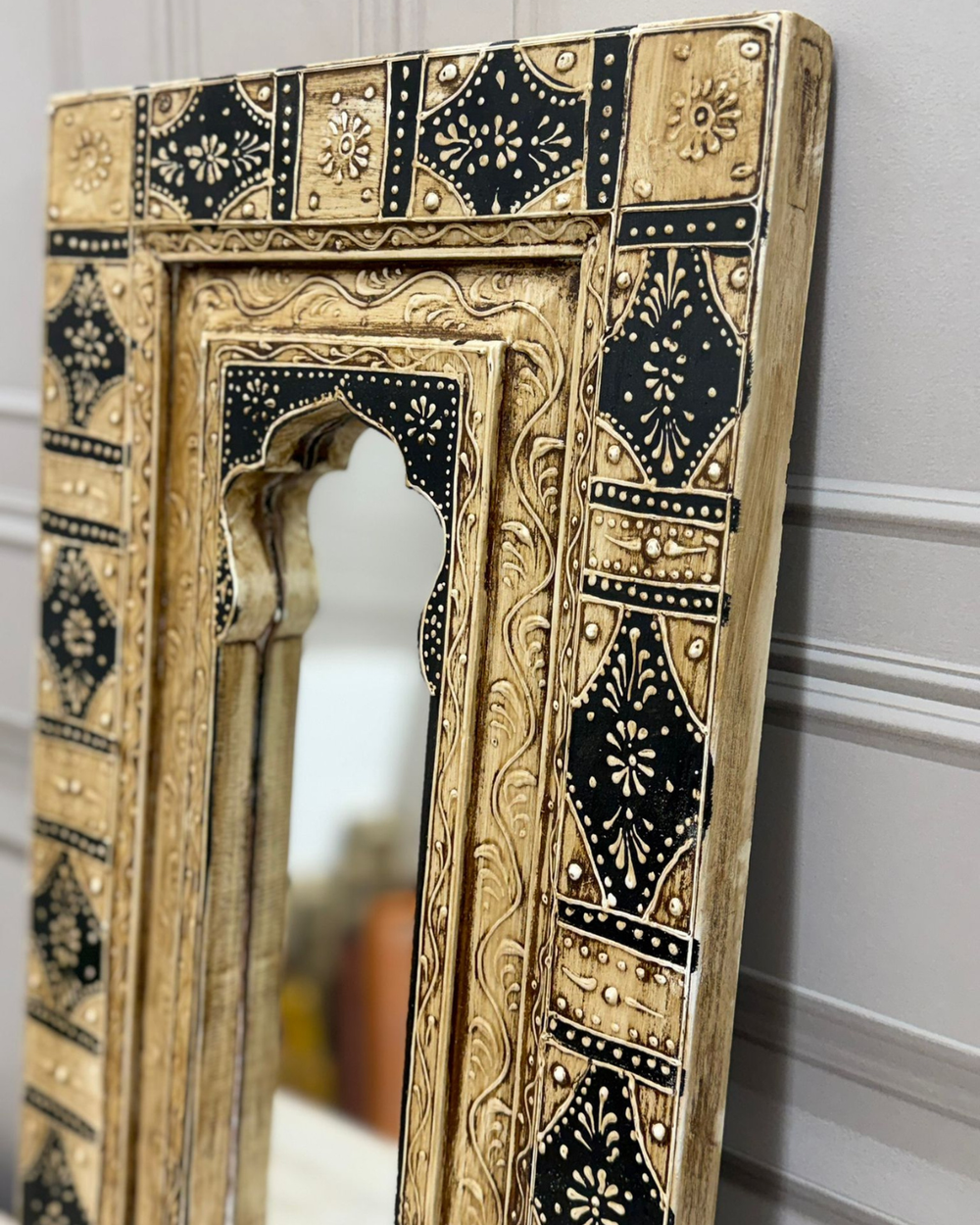 Hand-Painted Reclaimed Mango Wood Vintage Mirror – Black & Natural Carved Frame