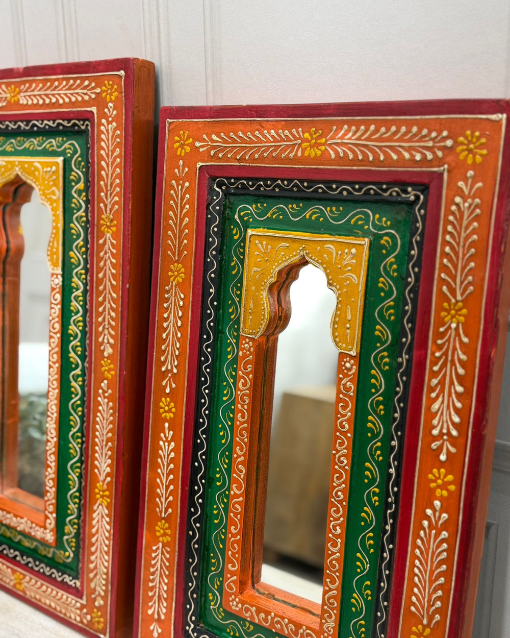 Pair of Hand-Painted Vintage Mango Wood Mirrors – Red & Green Arched Design (Mixed Sizes)