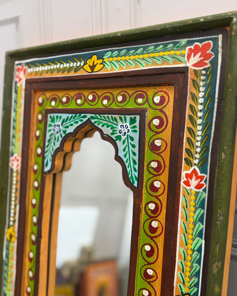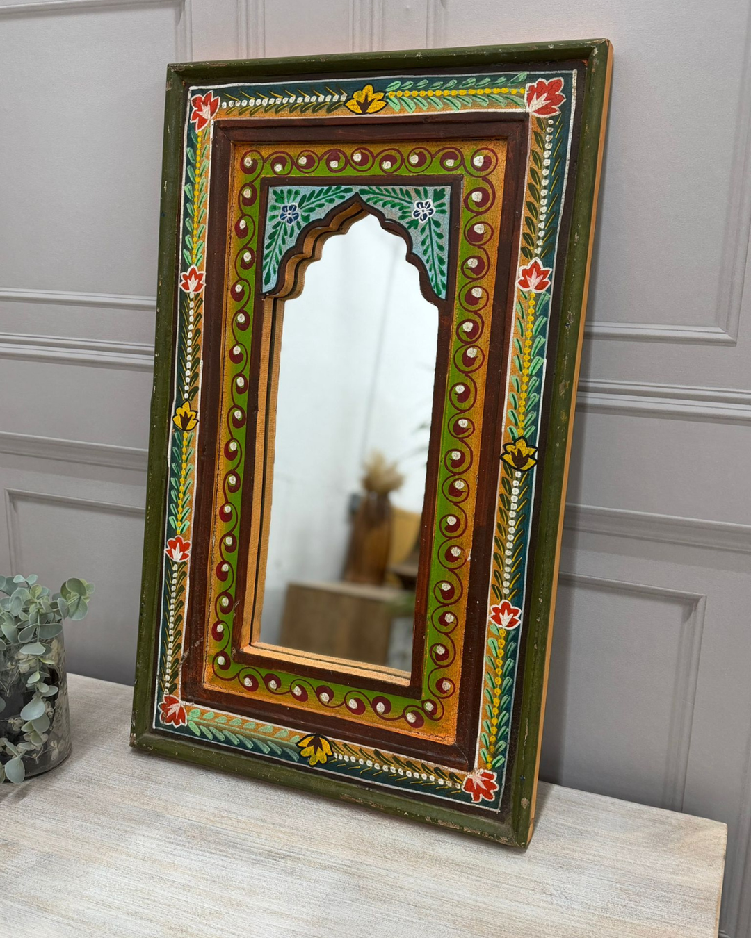 Hand-Painted Vintage Mango Wood Arch Mirror – Green Floral Frame
