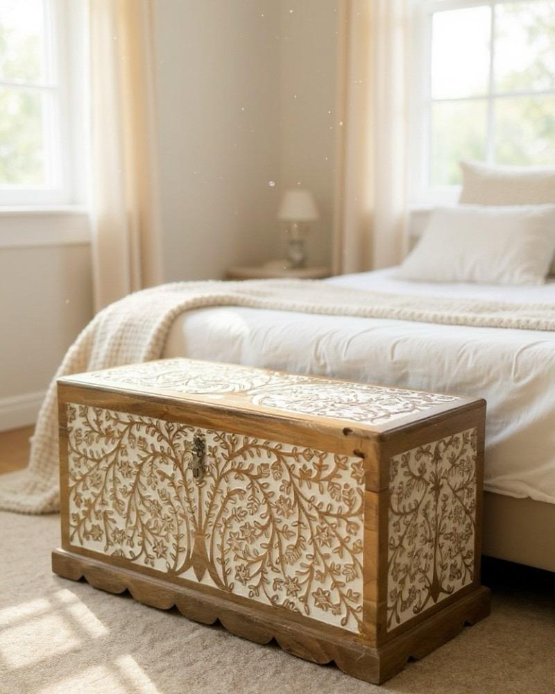 Hand-Carved Mango Wood Trunk – Tree of Life Design with Whitewashed Finish