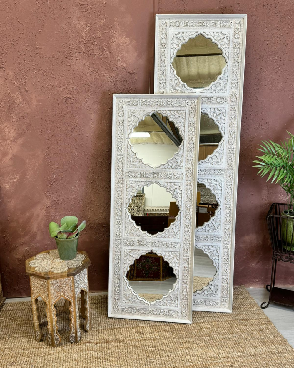 These stunning hand-carved wall mirrors are crafted from durable Mango wood and adorned with traditional Indian designs. Each mirror features intricate patterns that bring a touch of timeless elegance and cultural heritage to your space. Available in two sizes, the small mirror includes three mirrored sections, while the large variant offers four sections, providing a captivating visual appeal. These mirrors are designed for versatile display, allowing them to be mounted vertically or horizontally to fit your decor needs. Perfect for adding a sophisticated and artistic statement to your home.